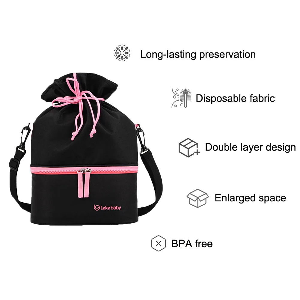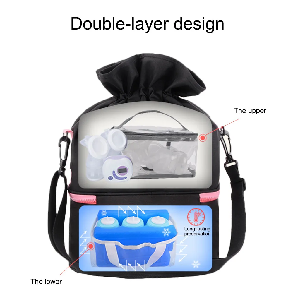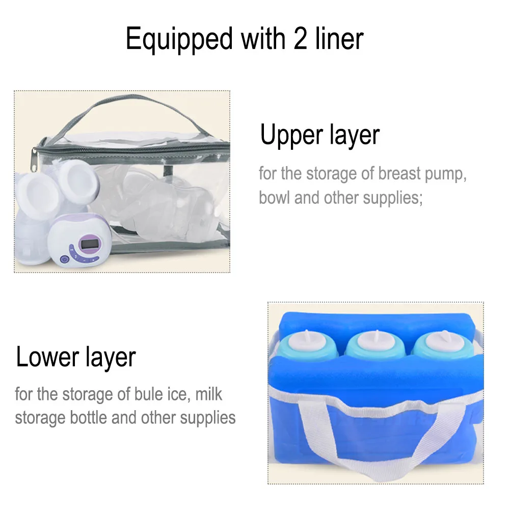2. Double-layer double liner design: upper layer: enlarged upper layer design for storage of breast pump, bowl and other supplies; lower layer for milk storage and preservation. Two separated layers design ensures its sanitation.