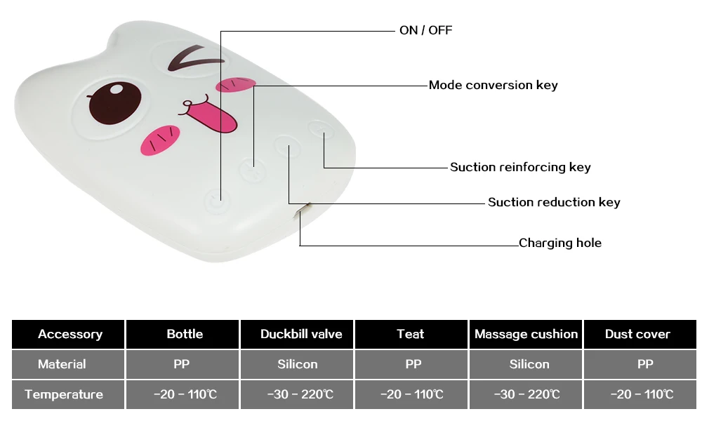 Package Content: 1 x Breast Pump, 1 x Main Engine, 1 x USB Cable, 1 x Duckbill Valve, 1 x Silicone Tube, 1 x Dust Cover, 1 x Natural Shaped Teat