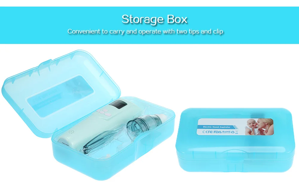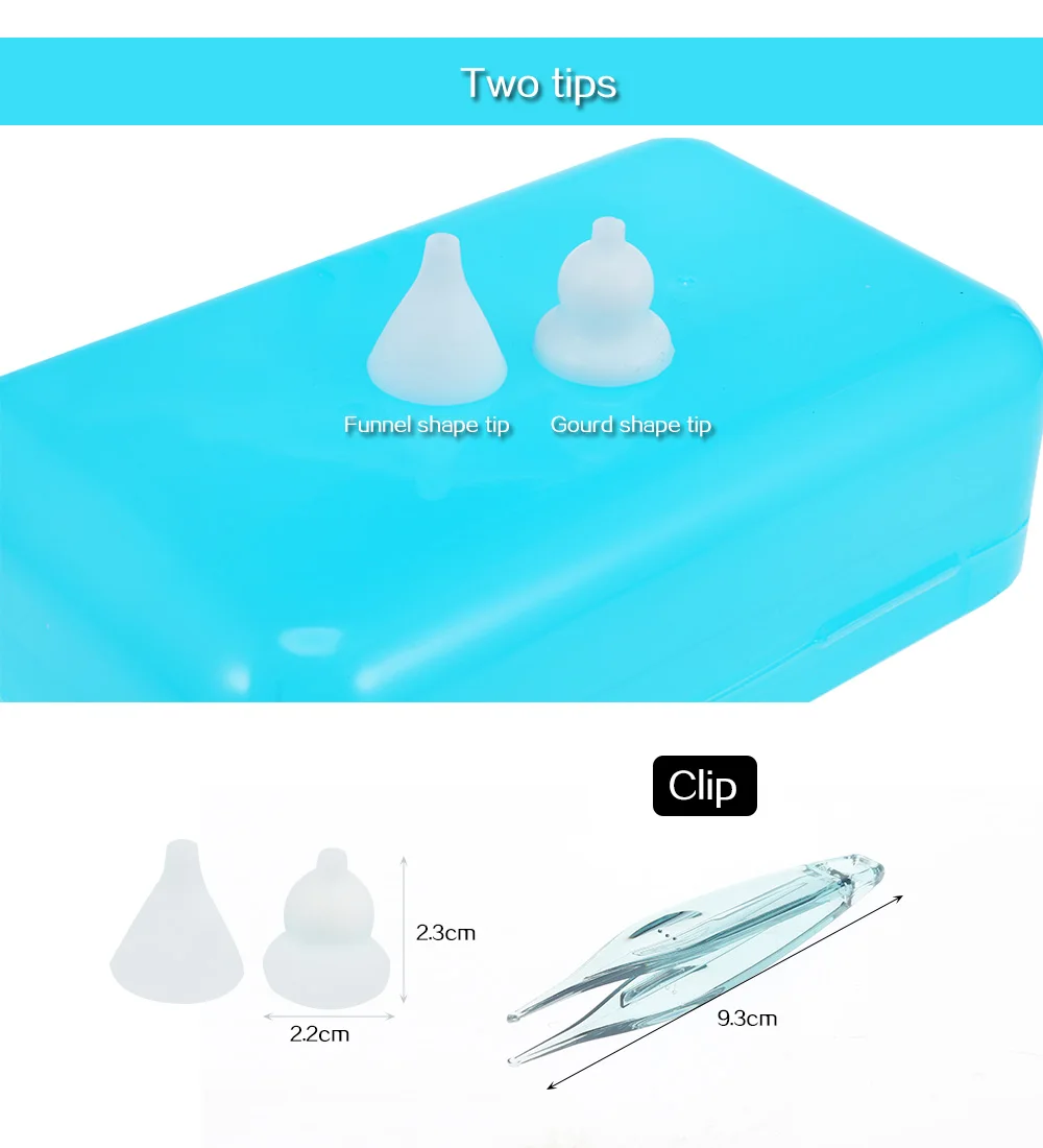 Package Content: 1 x Nasal Aspirator Handle, 1 x Nasal Aspirator Head, 1 x Gourd Shape Tip, 1 x Funnel Shape Tip, 1 x Storage Box, 1 x Nipper, 1 x English User Manual
