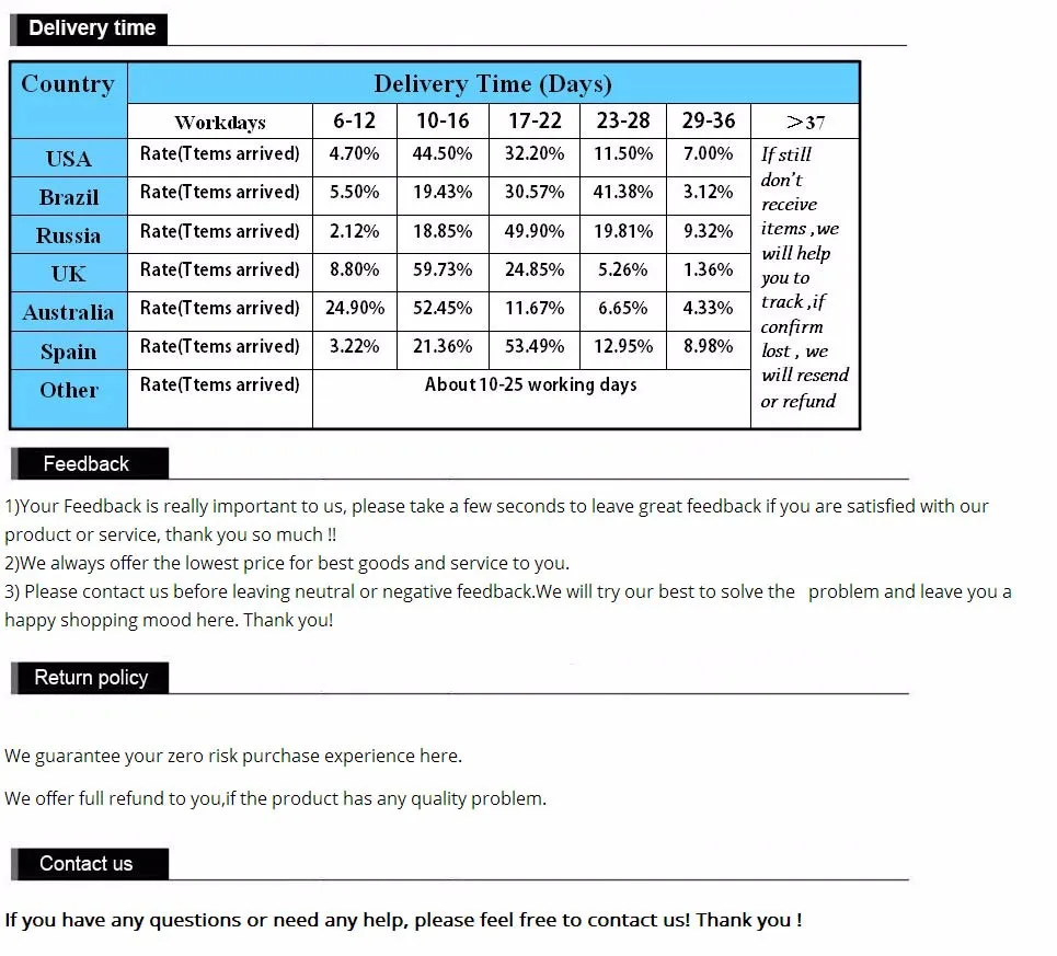 • If you did not receive the product within the guaranteed time( 45 days not including 2-5 day processing) you can request a refund or a reshipment.