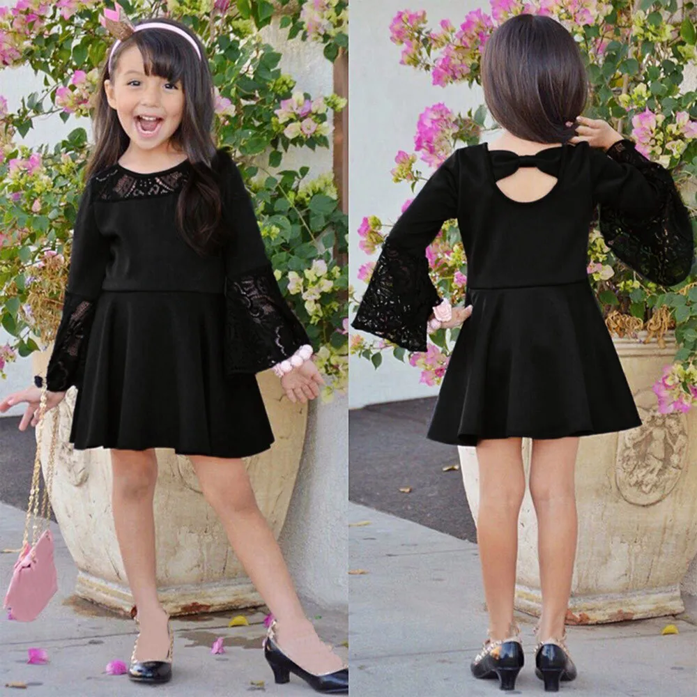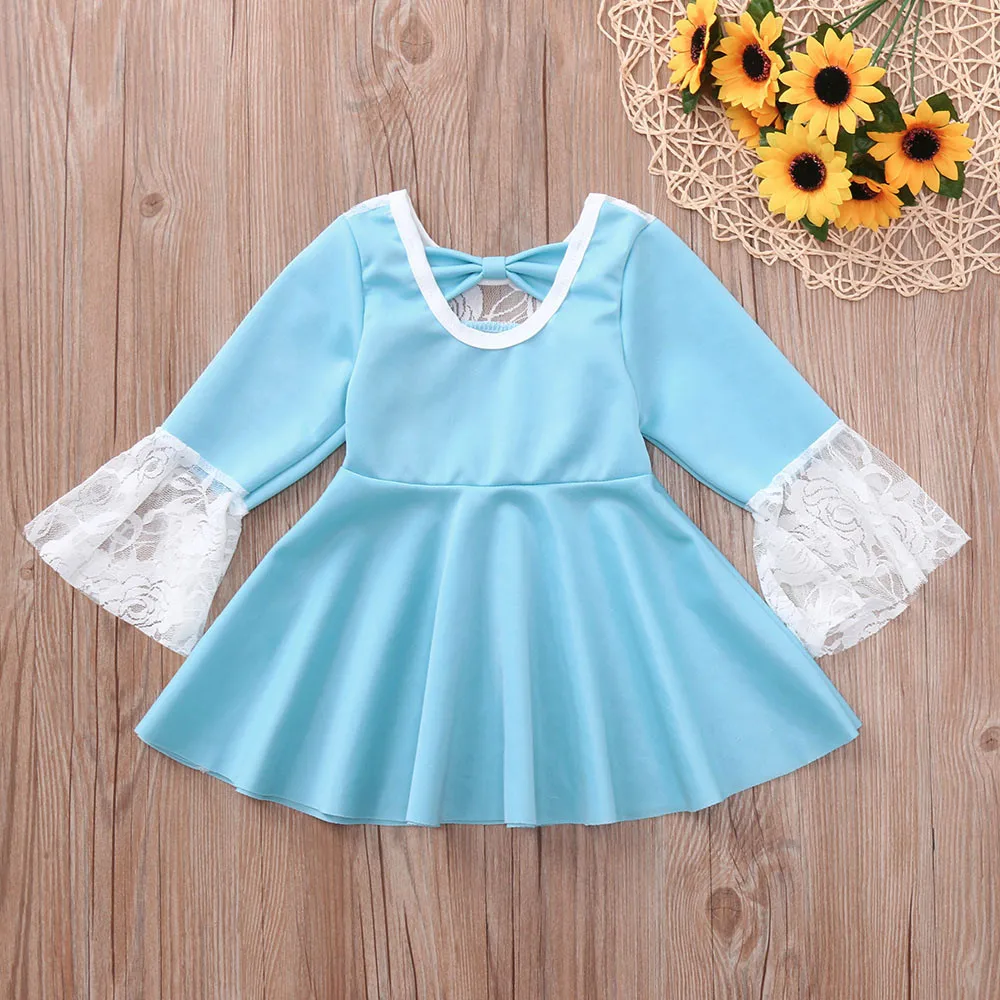 Toddler Infant Baby Girl Long Sleeve Lace Dress Solid Bow Princess Clothes Dress