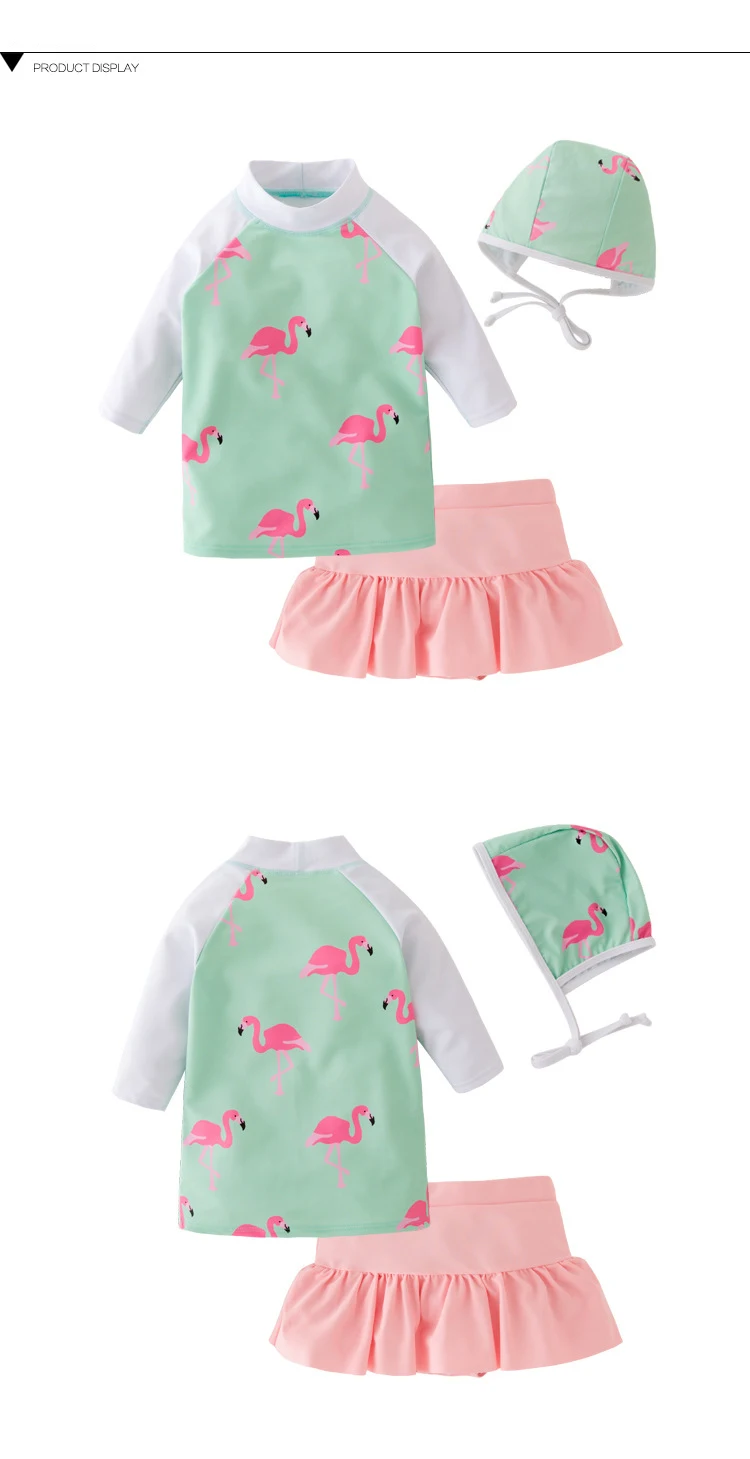 Baby Girls Swimsuit Long Sleeved Green Swan Flamingo Swimwear for Kids Children’s Summer Autumn Swimsuit Swimming Pool UV Sets