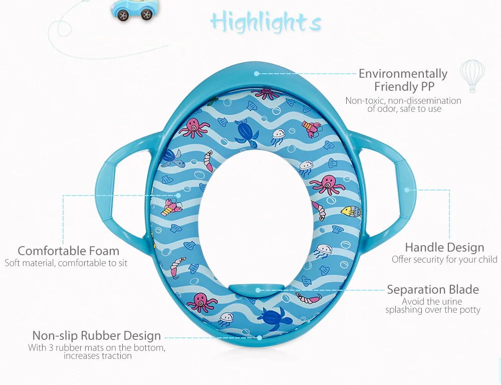 The cartoon print and bright colors make potty training fashionable and fun. Help your toddler transition to the potty, make your child feel more secure!