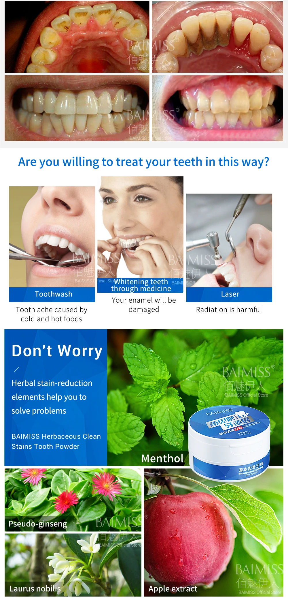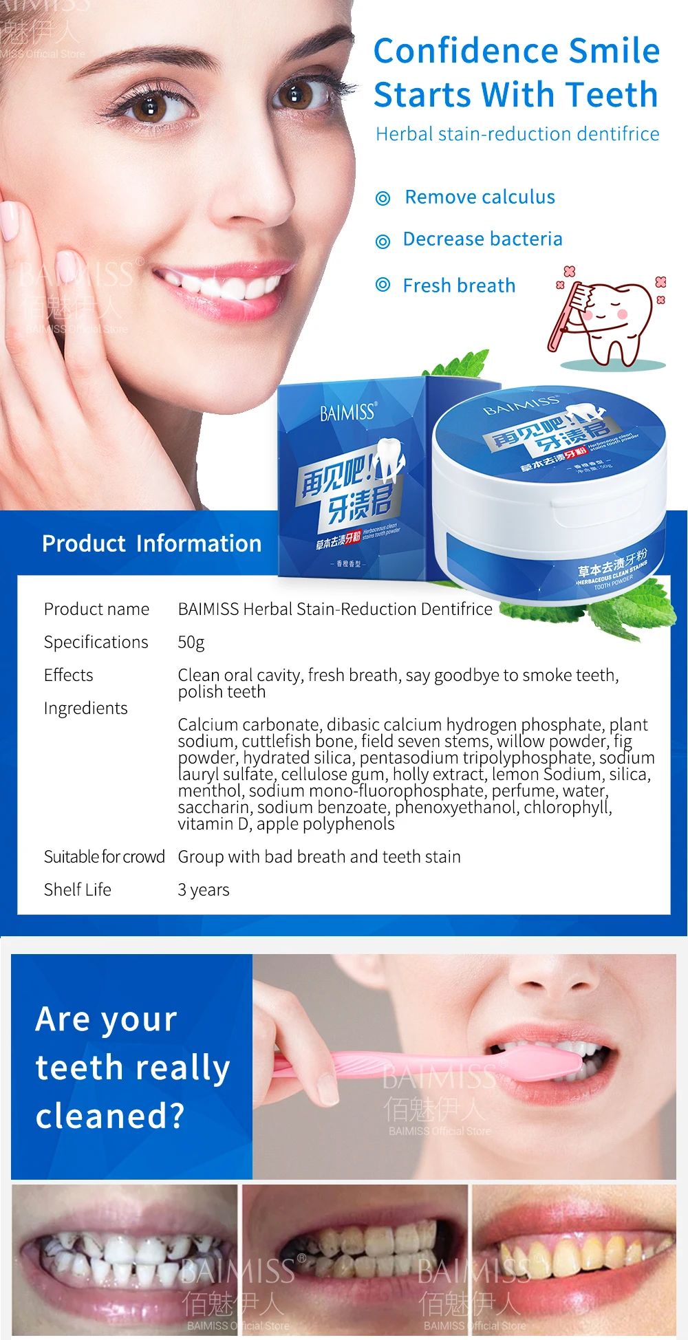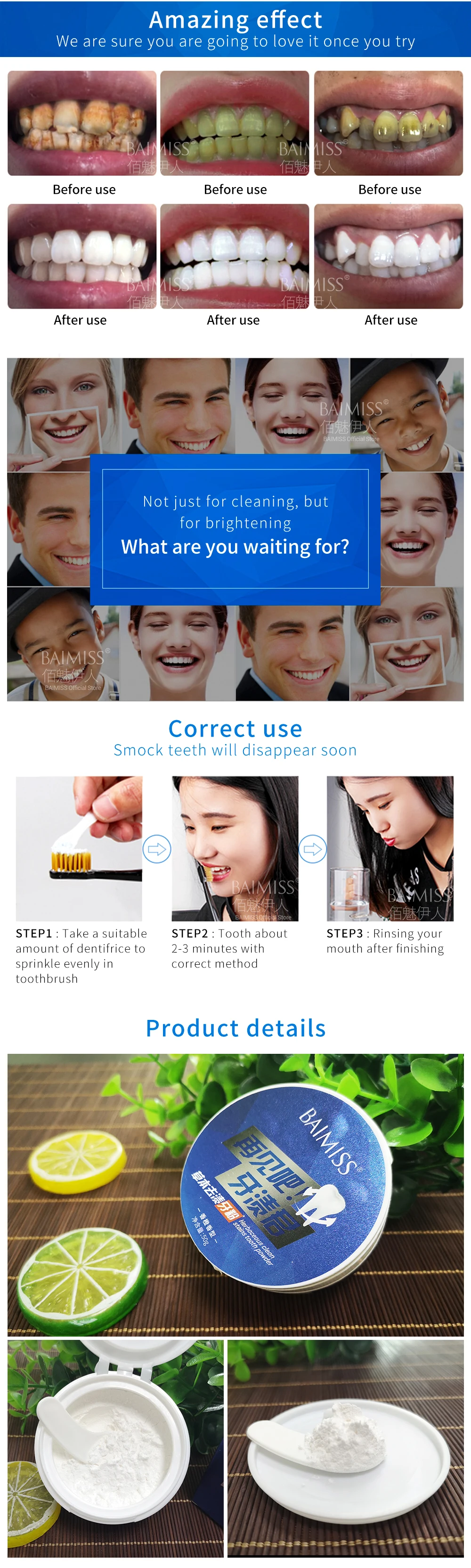 BAIMISS Teeth Whitening Powder 50g Herbal Safe White Tooth Perfect Smile Oral Hygiene Dental Brighten Tool Tartar Stains Remover