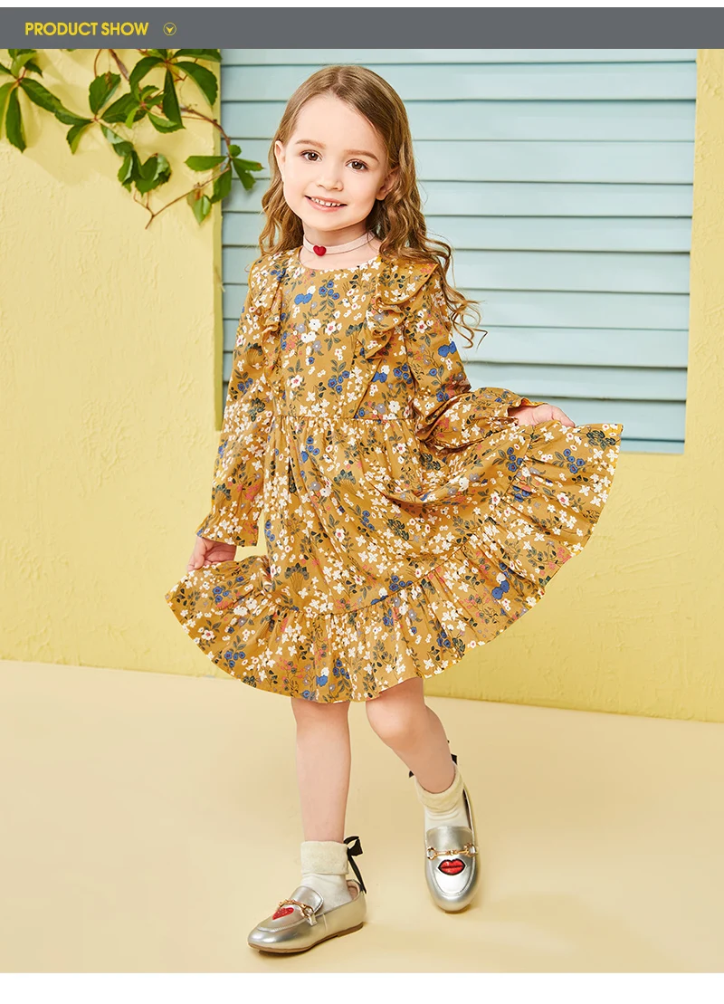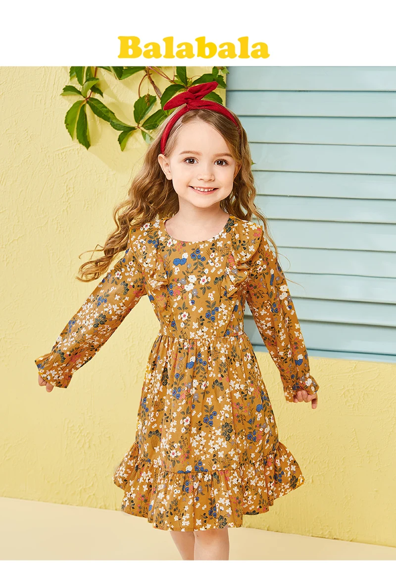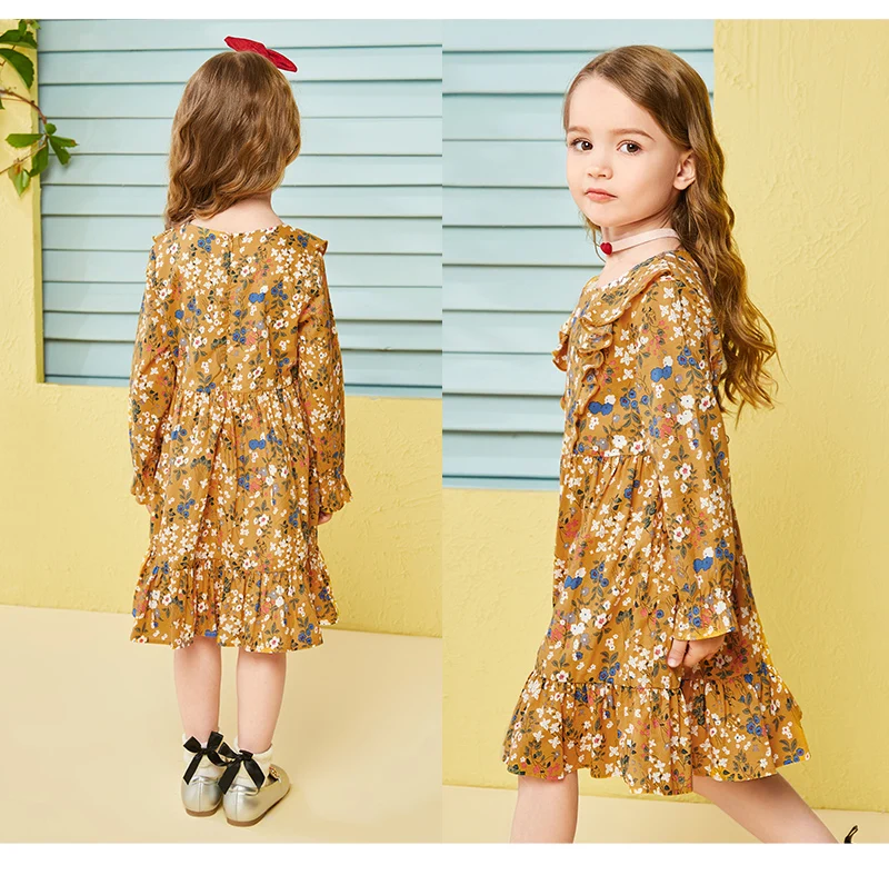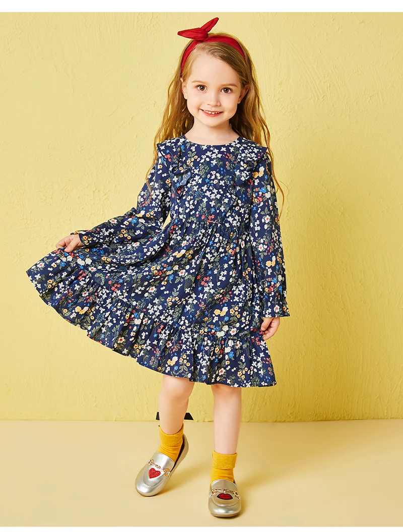 Balabala cotton floral dress for girls with round neck and ruched dresses hem children’s autumn dress elegant dress for girls