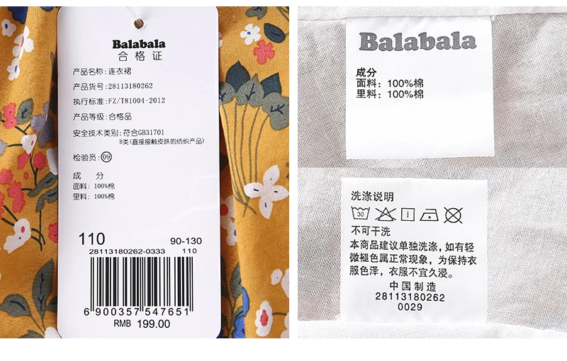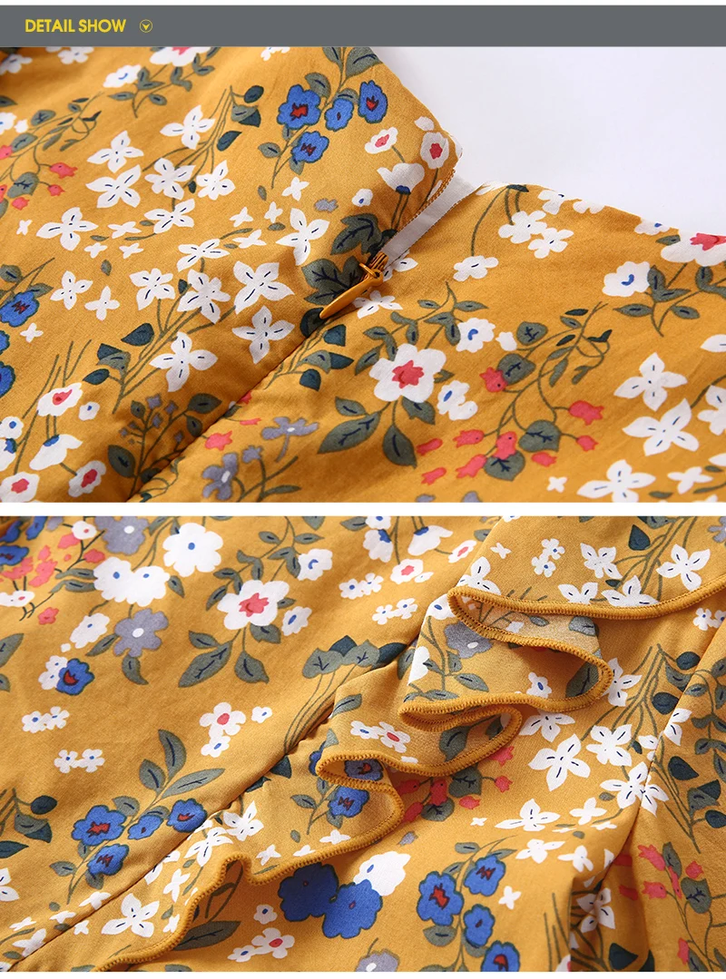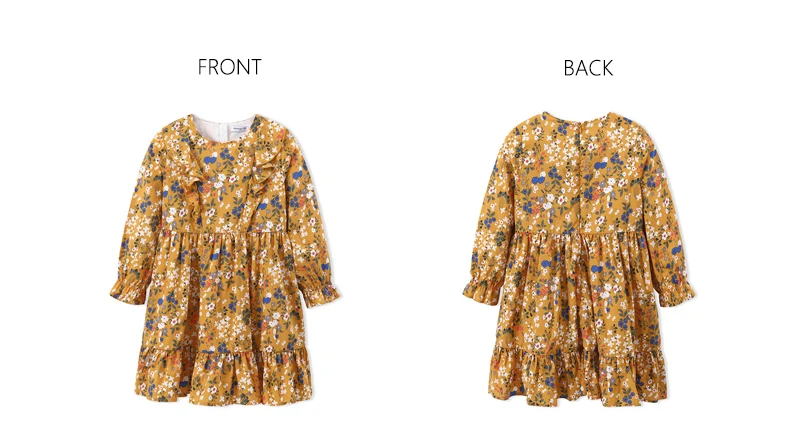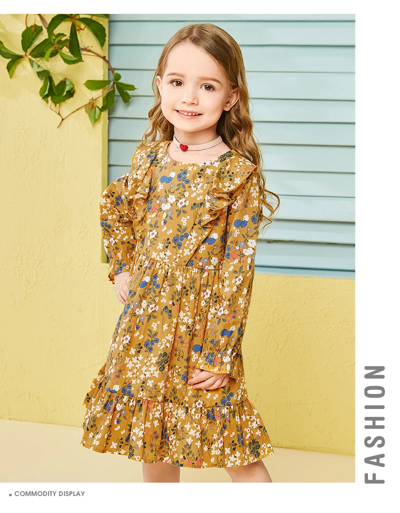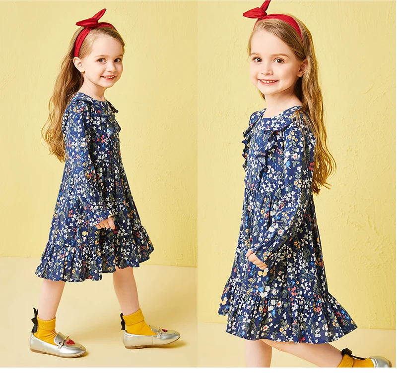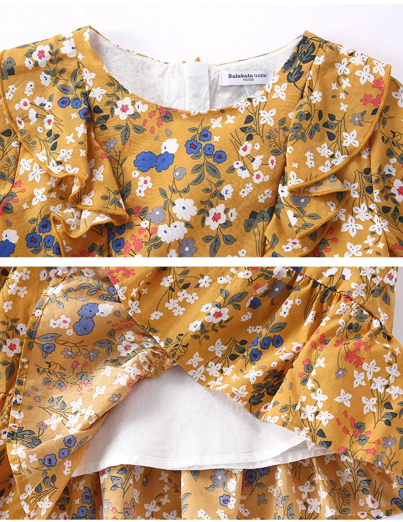 Balabala cotton floral dress for girls with round neck and ruched dresses hem children’s autumn dress elegant dress for girls