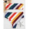 Stripes are so popular with beach ladies, and that’s why we have this colorful striped bikini for your summer wardrobe. It is designed with a tube bikini top and a pair of high waisted briefs with high-cut legs to elongate the figure. The rainbow stripes make it stand out in the crowd that you will be the focus on the beach sands.