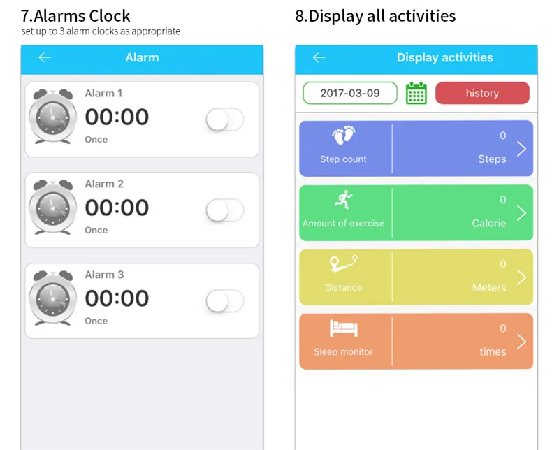 6, pedometer, time and date, alarm clock