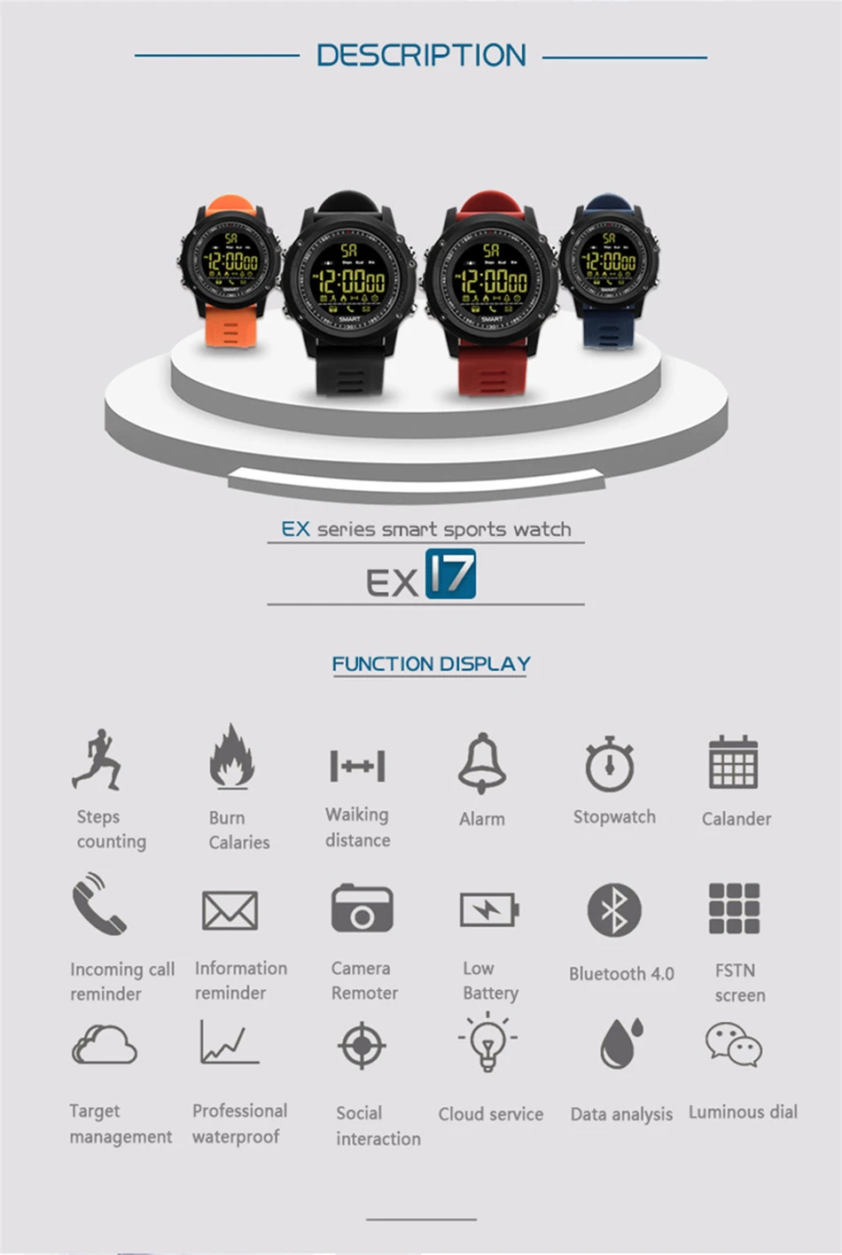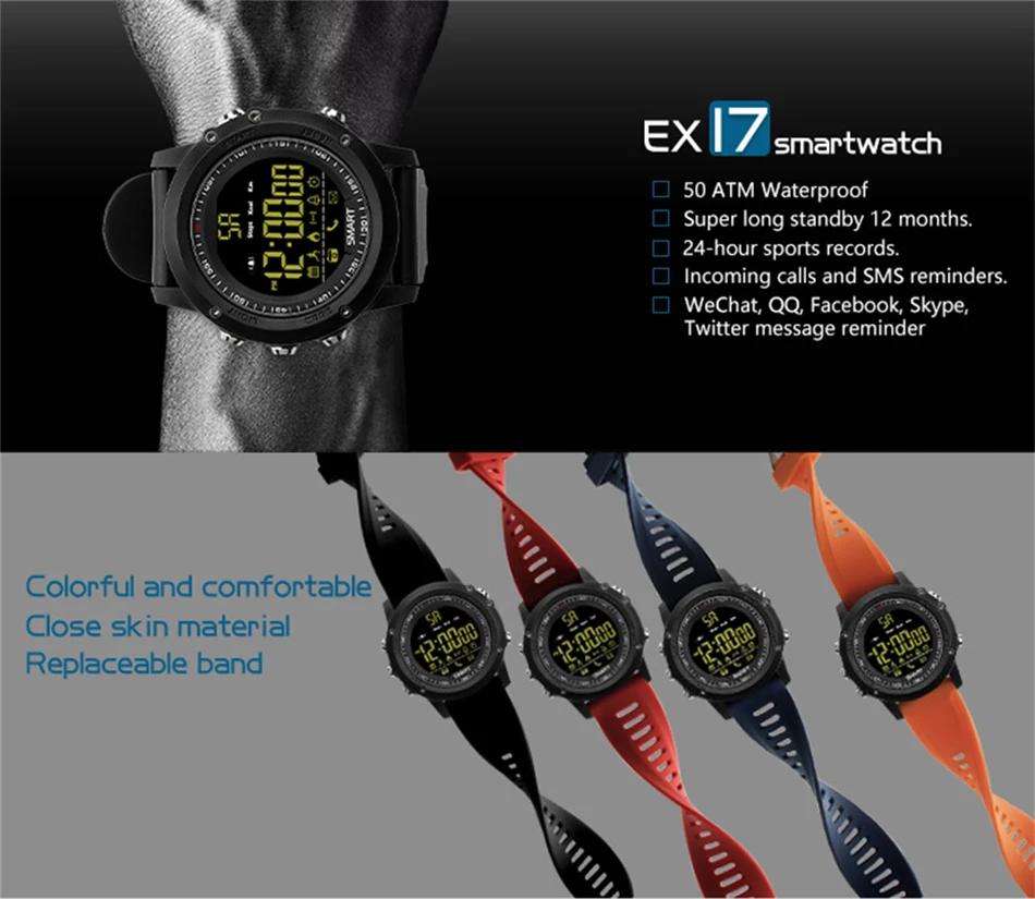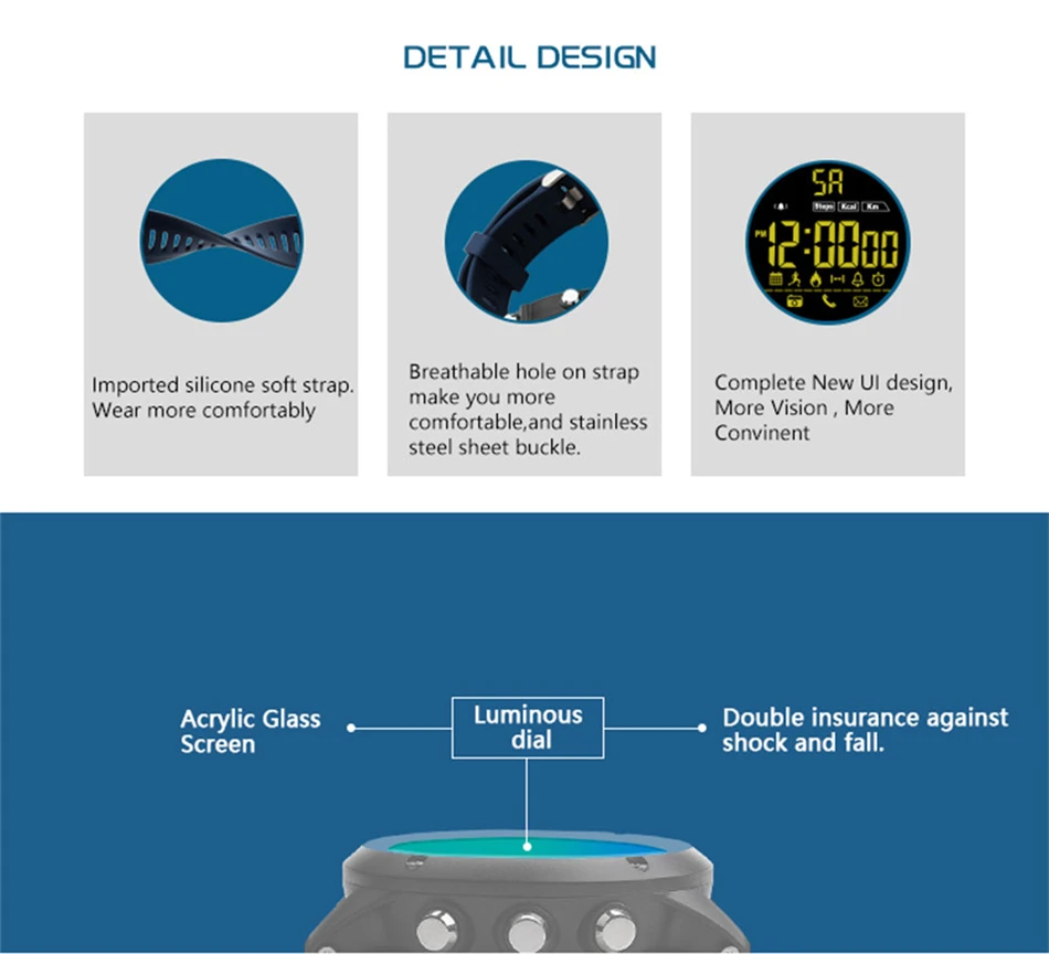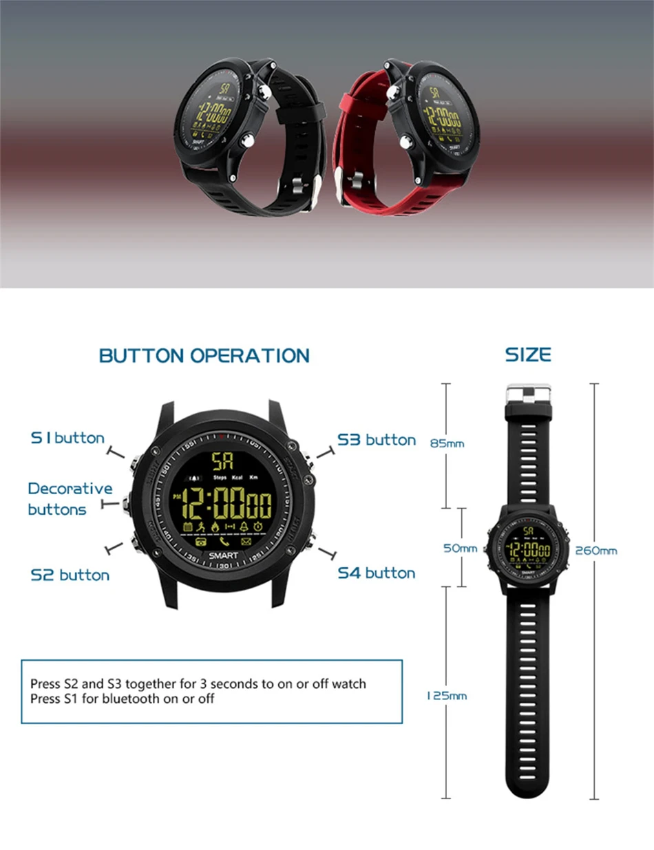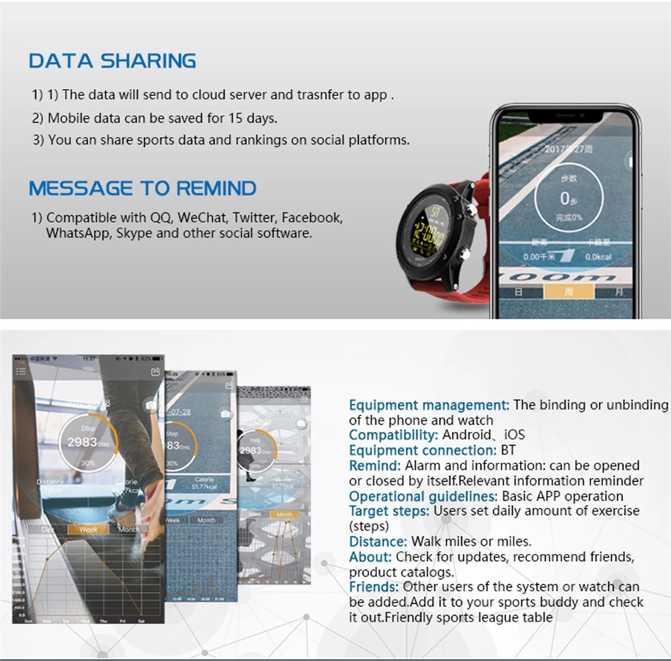 2.Step counting, sports management, calories, sports distance, calendar, remote photo, phone SMS notification; WeChat, QQ FACEBOOK, etc. Third-party information reminder Full-time display, stopwatch, alarm clock,