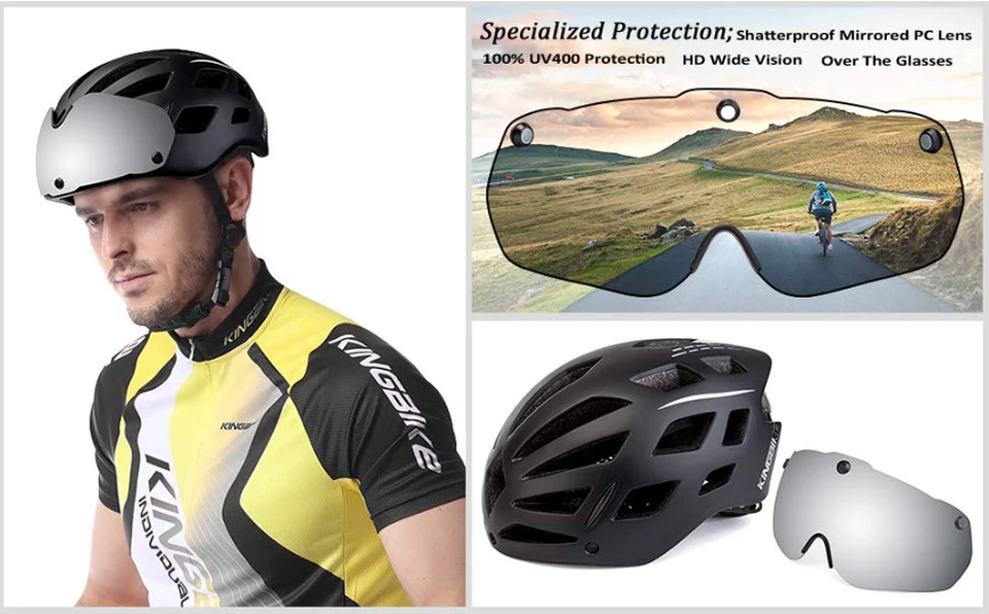 - Not Only Protect Your Head: KINGBIKE Magnetic detachable UV400 protection Eye Shield is made from High quality shatterproof PC with coating which can Block 100% of both UVA and UVB Harmful Radiation like a professional cycling Glasses,and also provide you the HD Wide vision and Protected you from sun,elements,wind,dust etc,It can over your glasses for the myopia for your need