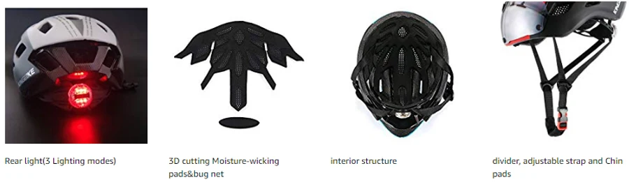 - 1.SAFETY CONSTRUCTION: In-mold polycarbonate shell with EPS liner construction with reinforced frame for additional safety,3D cutting Moisture-wicking pads&bug net inside keep rider’s head dry and wearing comfortable