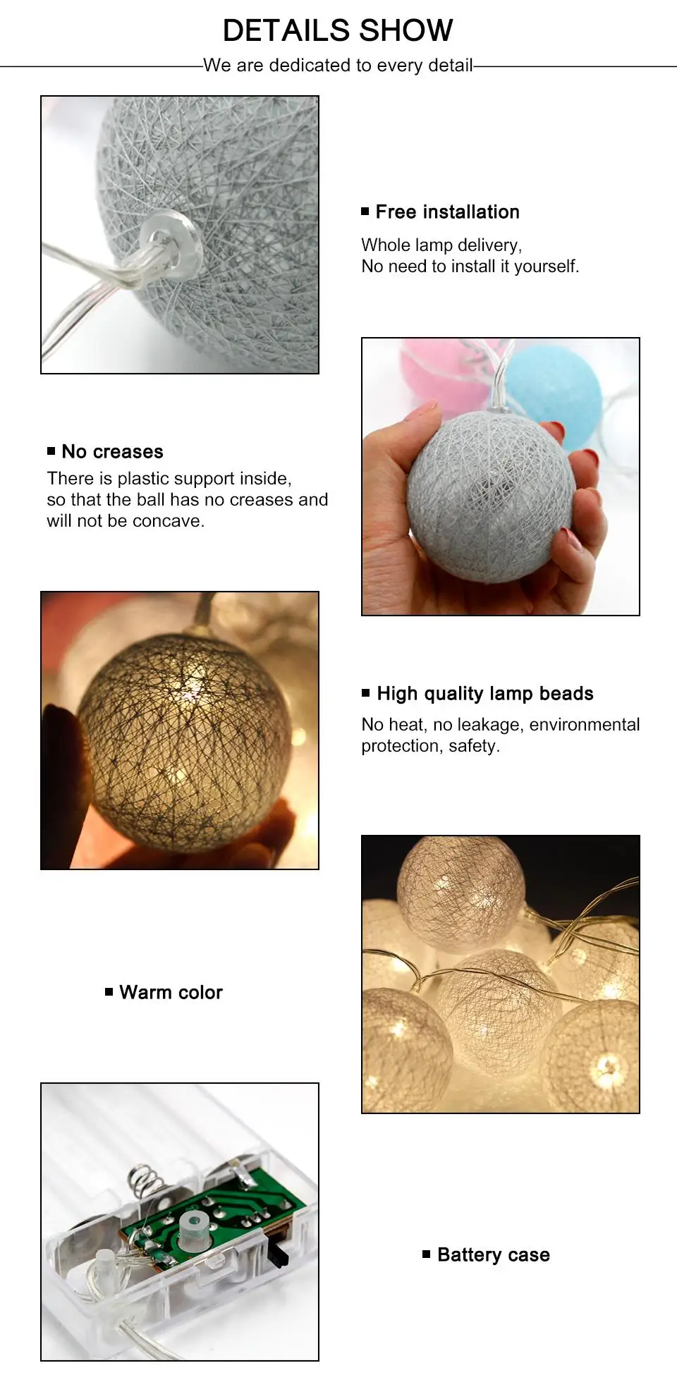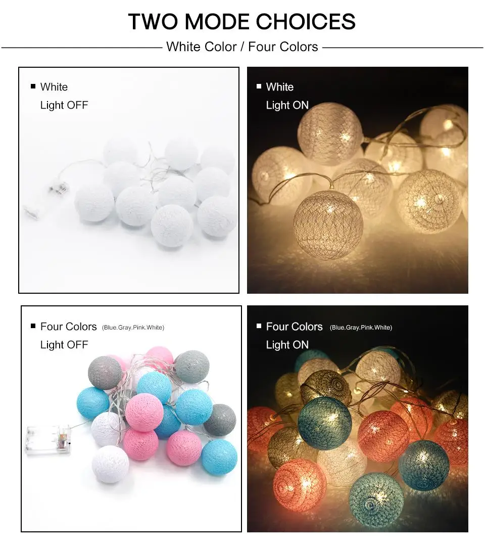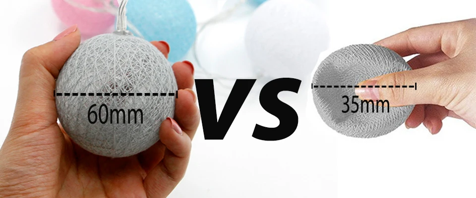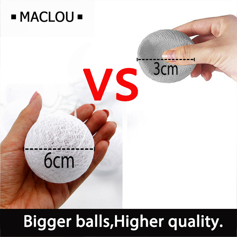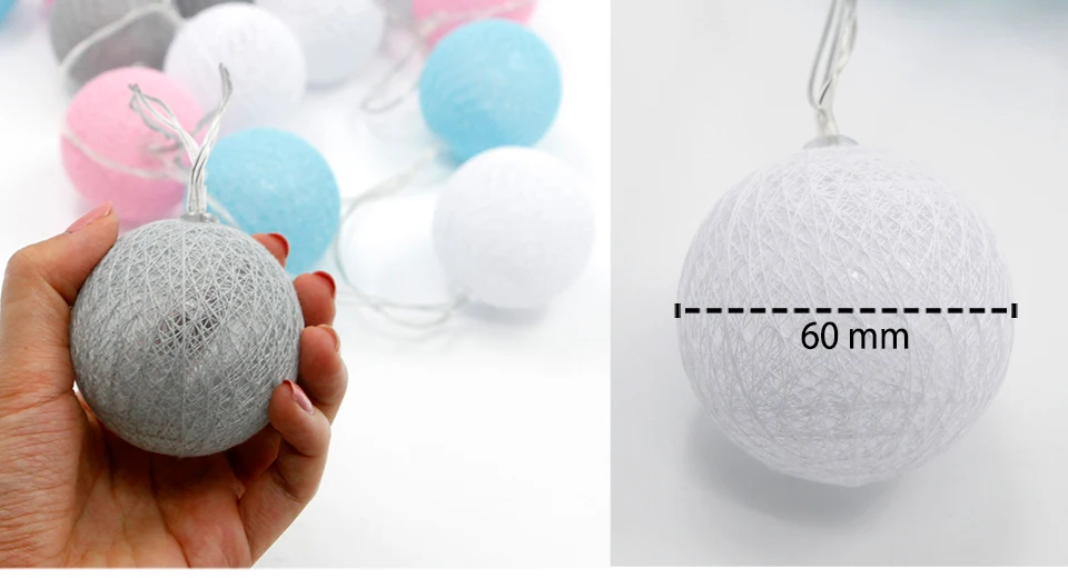 Our cotton balls light: Diameter:6CM ,The big ball is more decorative,No need to install, the battery box is not restricted by the plug and is suitable for all countries.