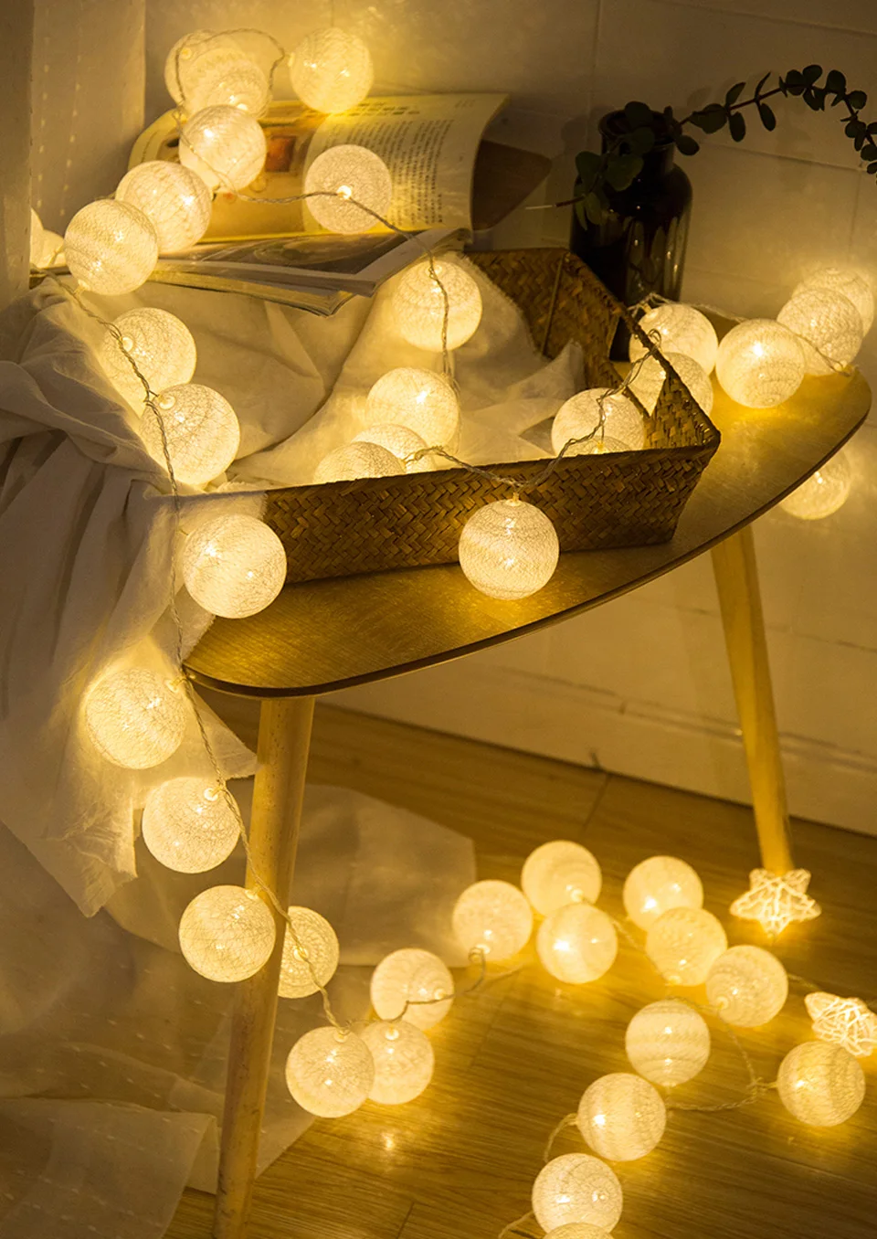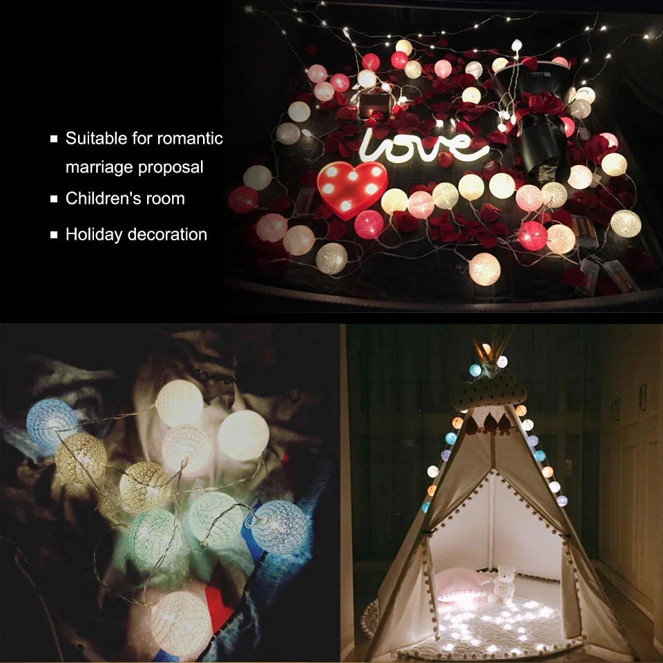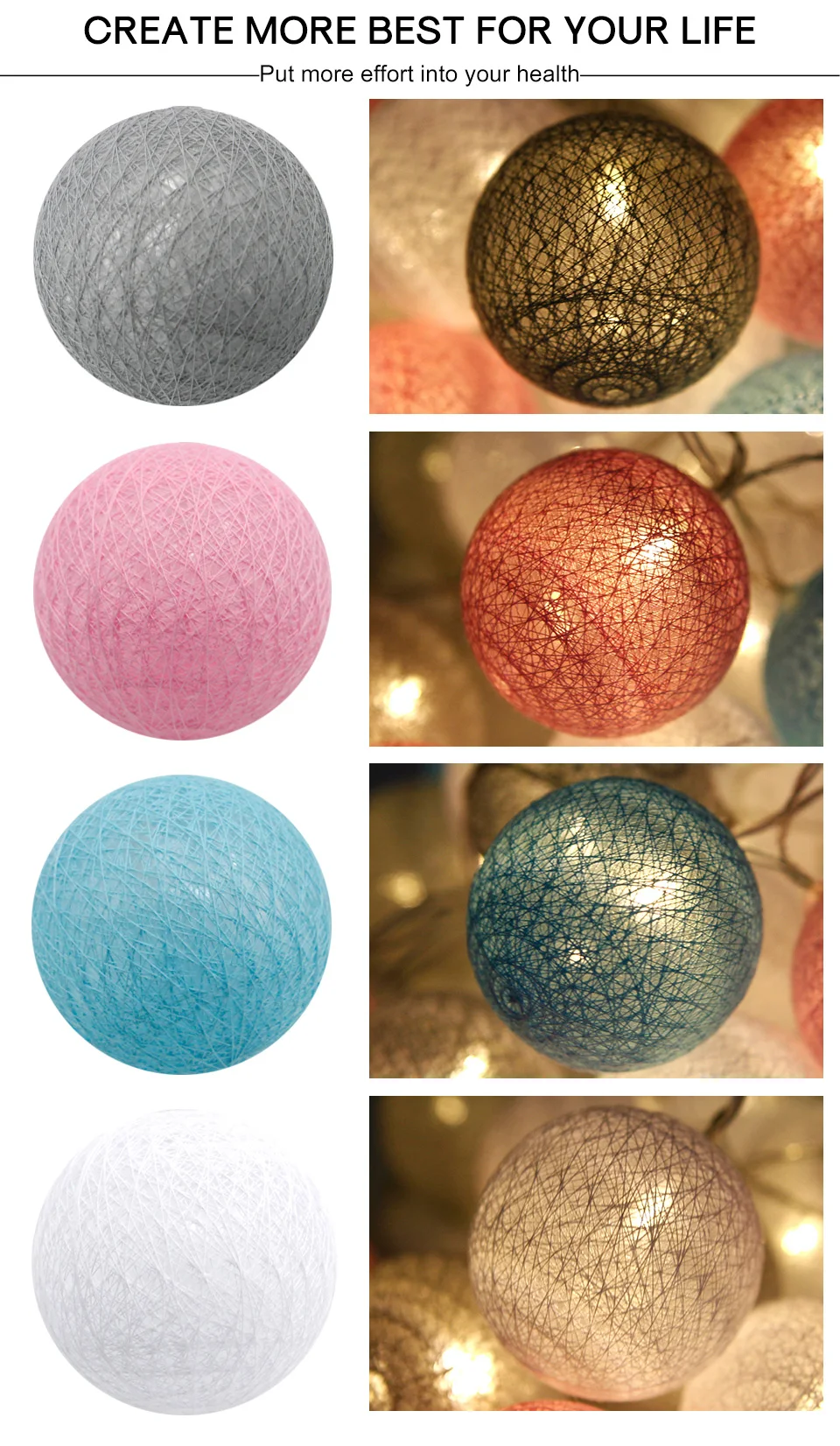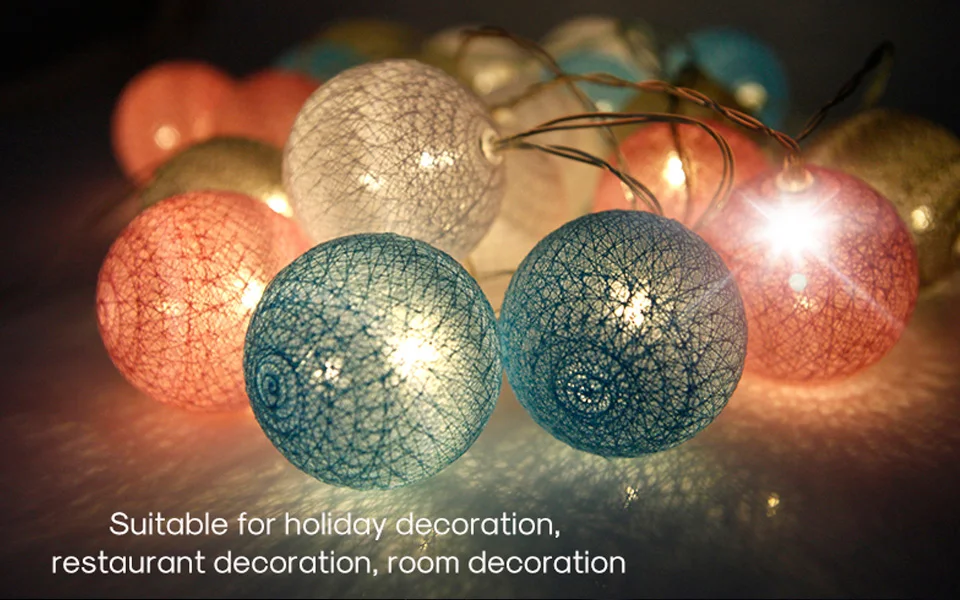 Our cotton balls light: Diameter:6CM ,The big ball is more decorative,No need to install, the battery box is not restricted by the plug and is suitable for all countries.