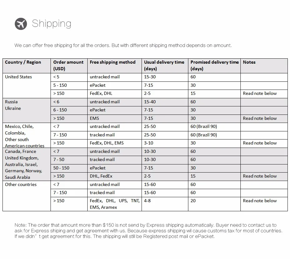 Packages from our warehouse in China will be shipped by ePacket or EMS depending on the weight and size of the product. Packages shipped from our US warehouse are shipped through USPS.