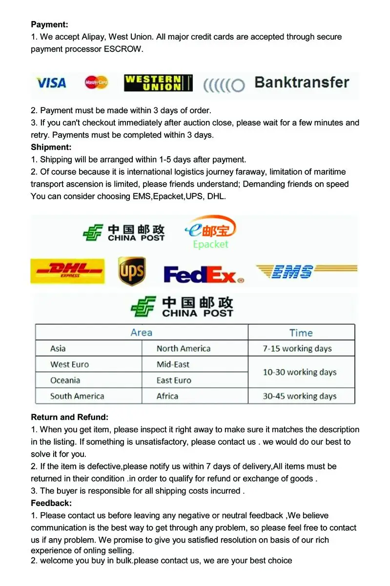 If you have any problems with our items or services, please feel free to contact us first before you leave negative feedback. We will do our best to solve any problems and provide you with the best customer services.