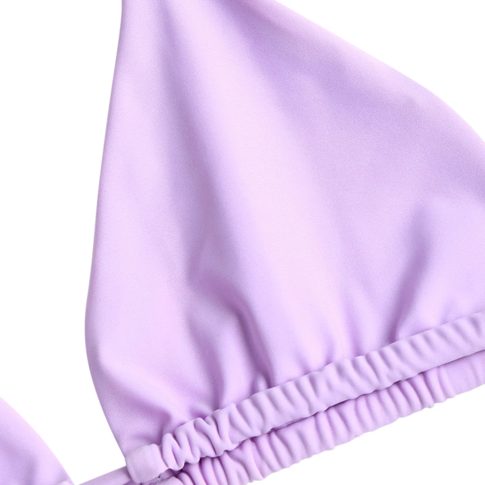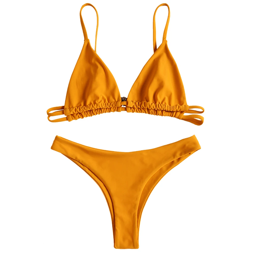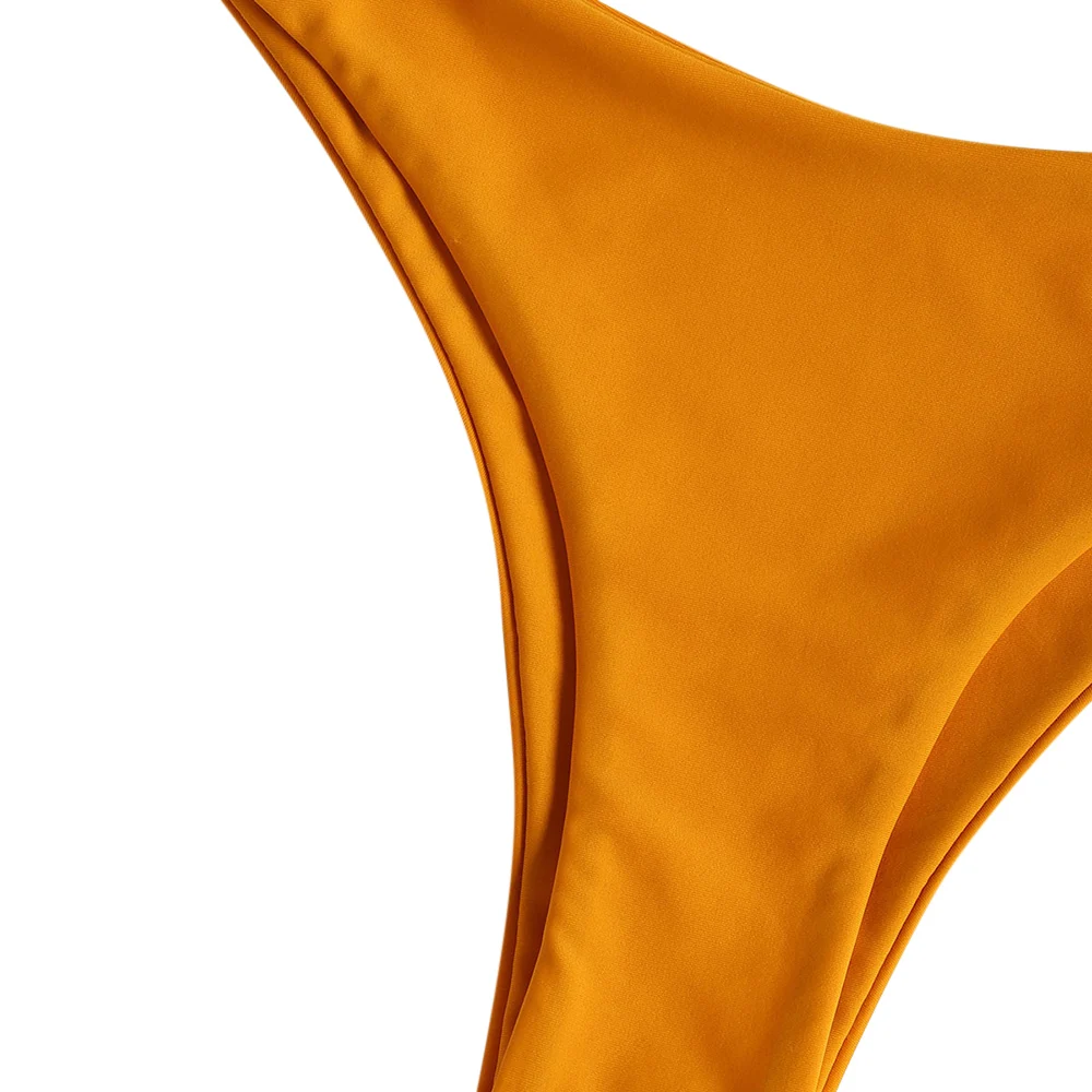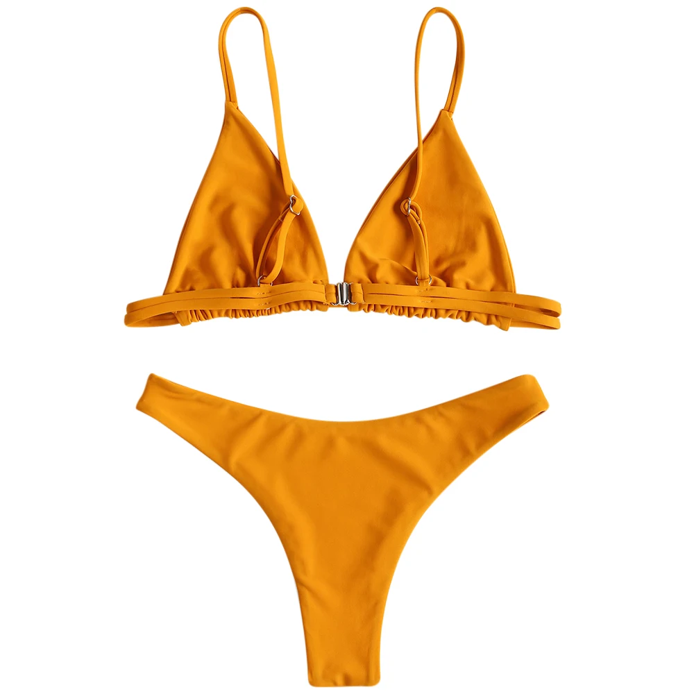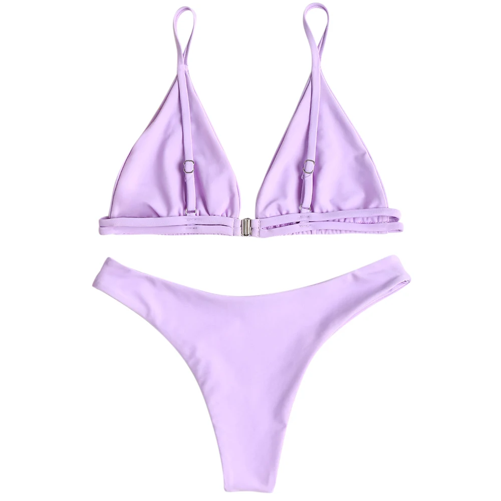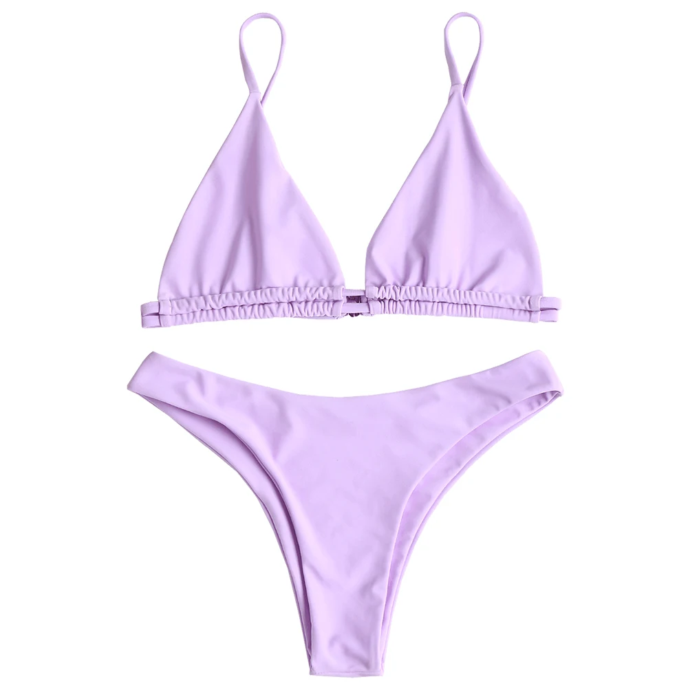 Enjoy the beautiful sunshine and the fun of water in this curve flattering bikini. It is divided into a triangle bra top with buckle closure on back and sexy high cut thong briefs. Bralette design makes it very comfortable to wear. Try to pair it with your favorite kimonos, you will love your look all the day!