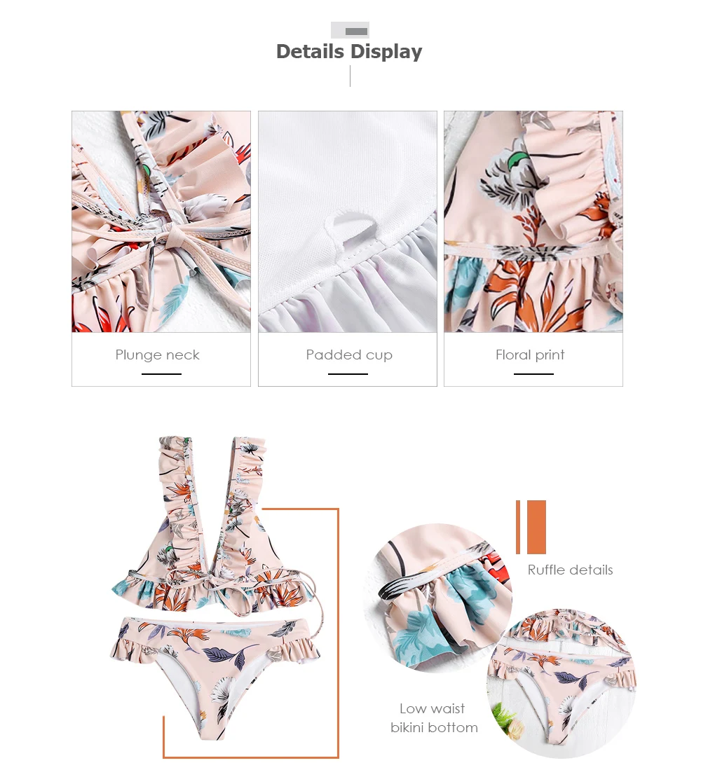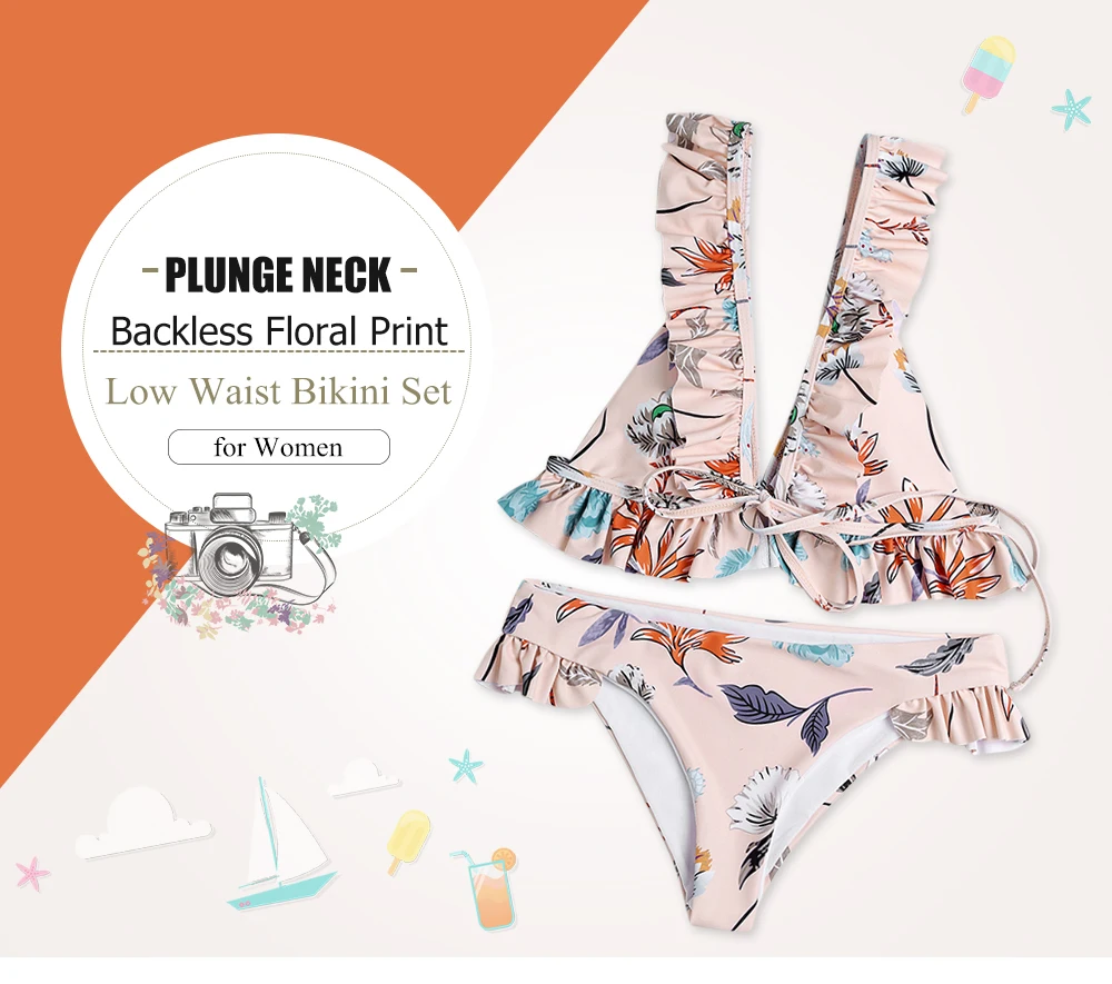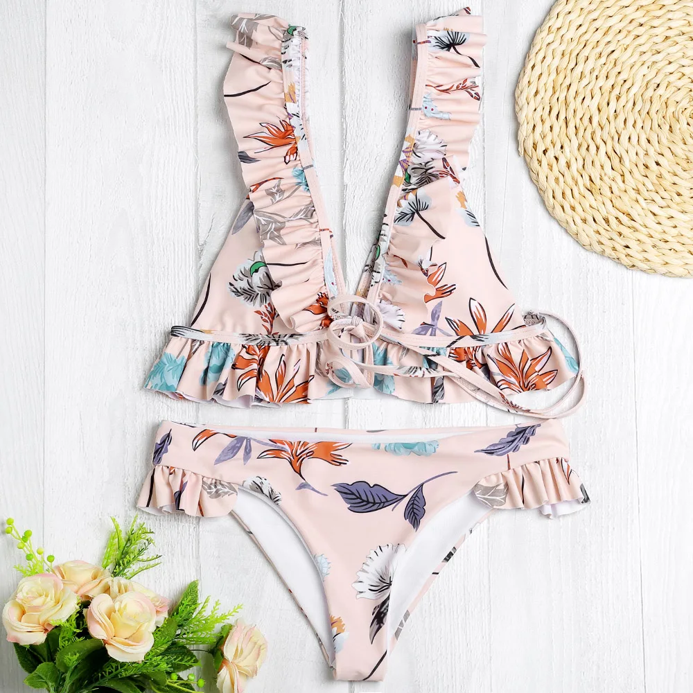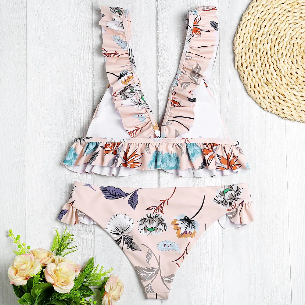 Belleziva Plunge Neck Backless Padded Ruffle Floral Print Women Bikini Set Vintage Swimsuit Female Swimwear Biquini Bathing Suit