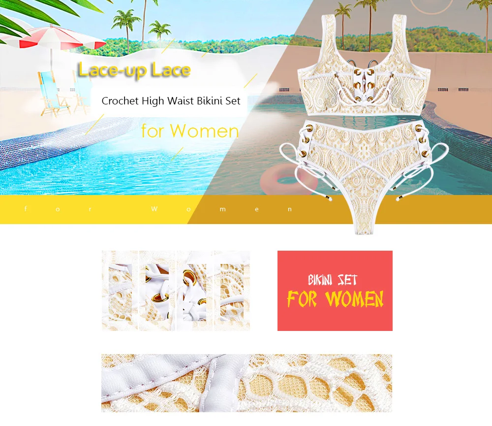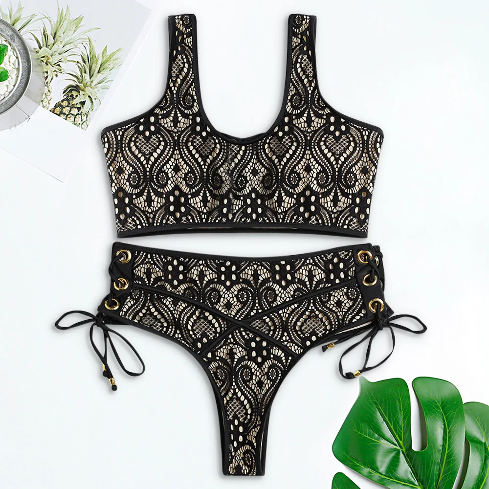 Belleziva Sexy Women Bikini Set Shoulder Strap Lace-Up Crochet High Waist Bandage Swimwear Push Up Swimsuit Bathing Suit Biquini