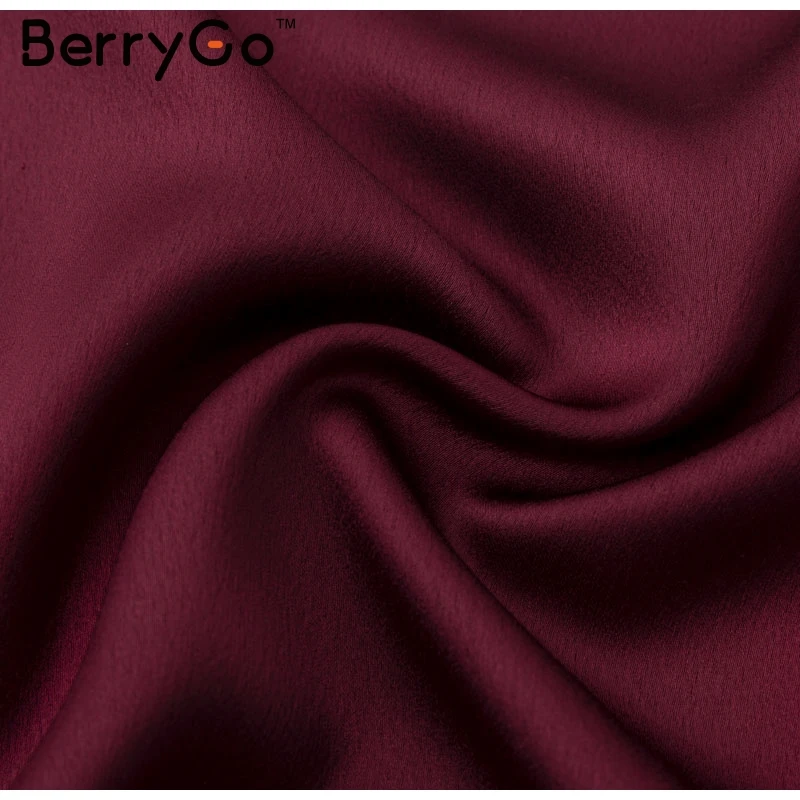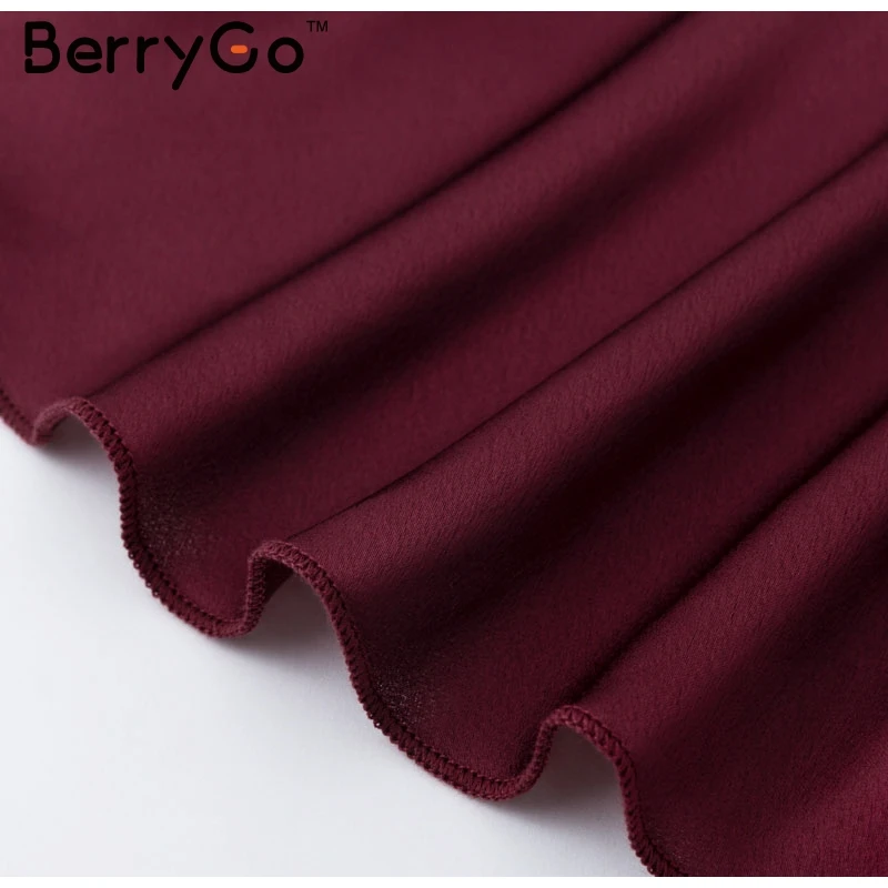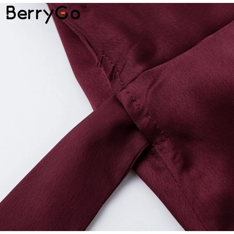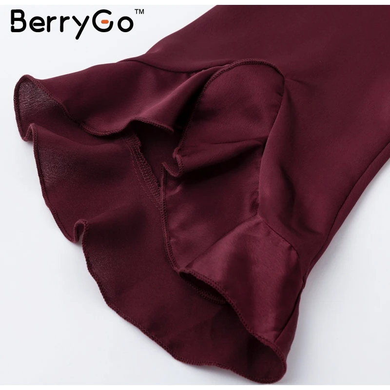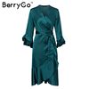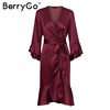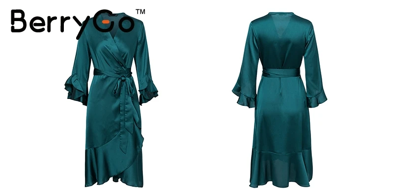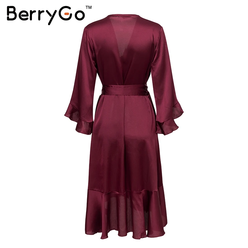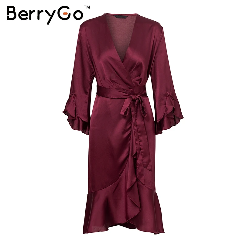 BerryGo Elegant ruffle satin women dress Flare sleeve sash wrap lady dress 2018 Autumn winter V neck sexy female dress vestidos