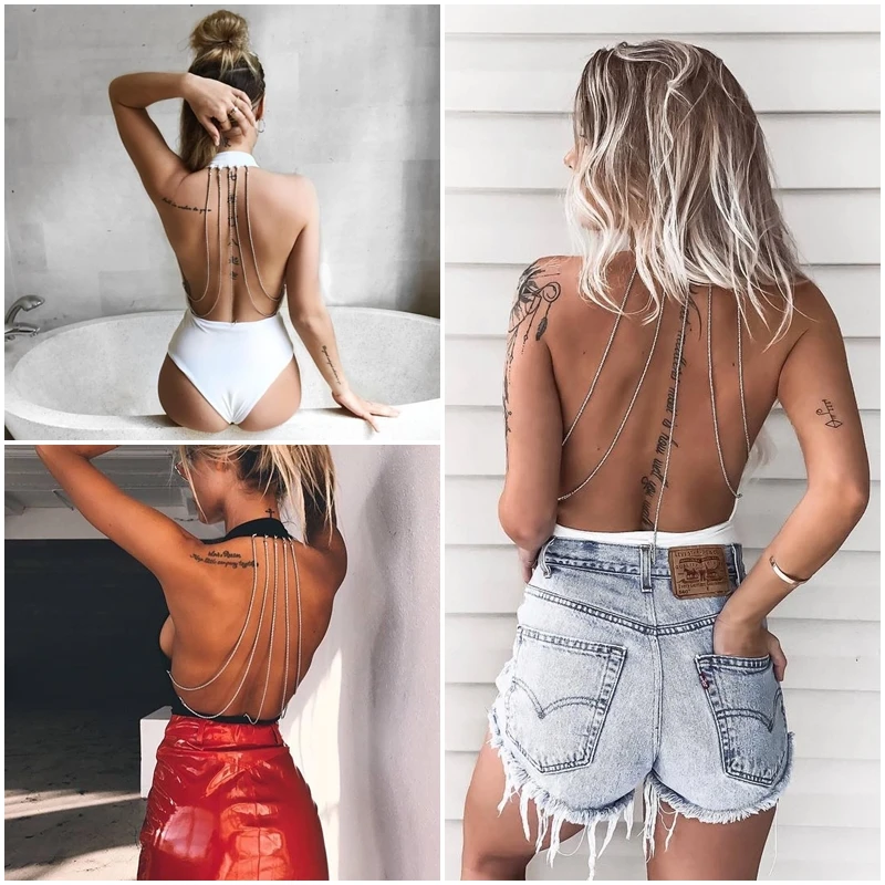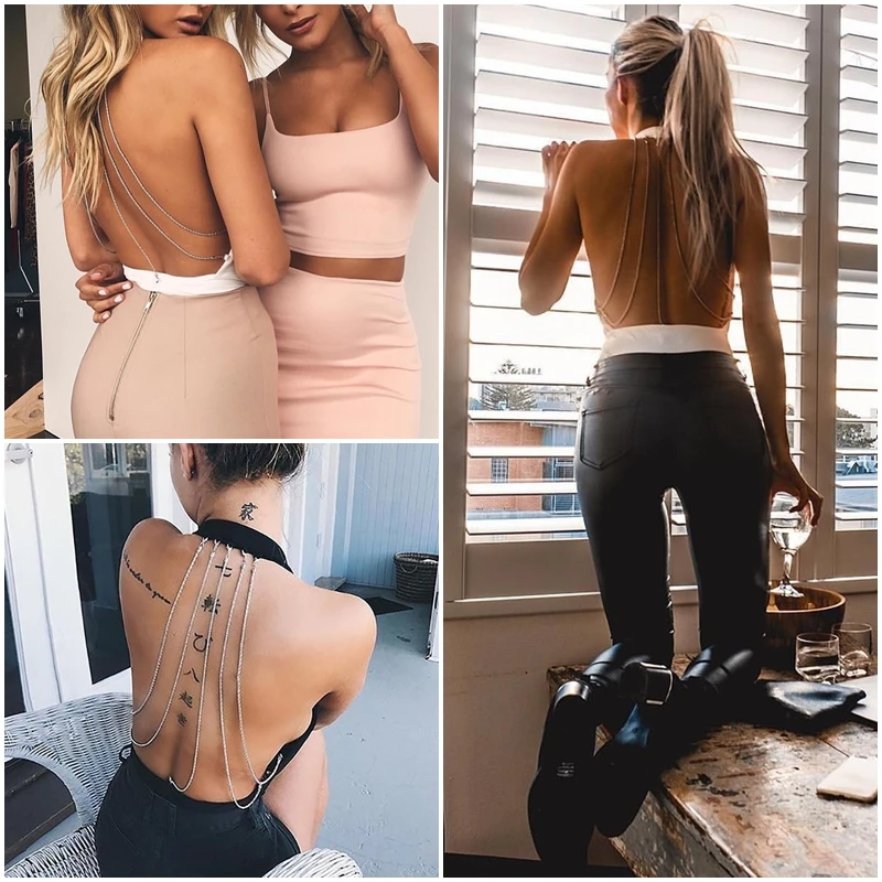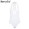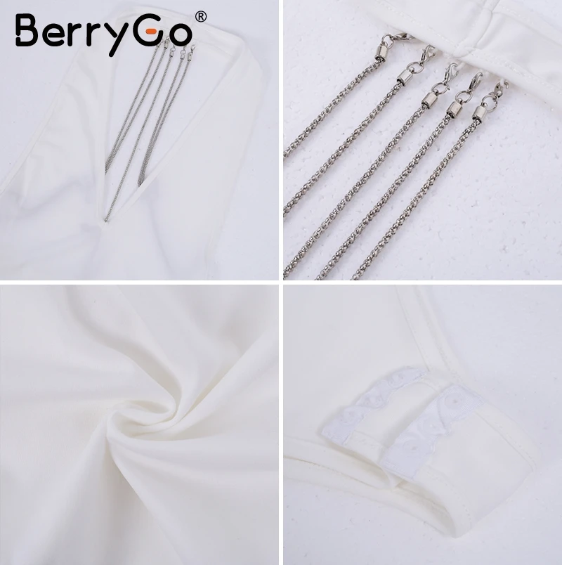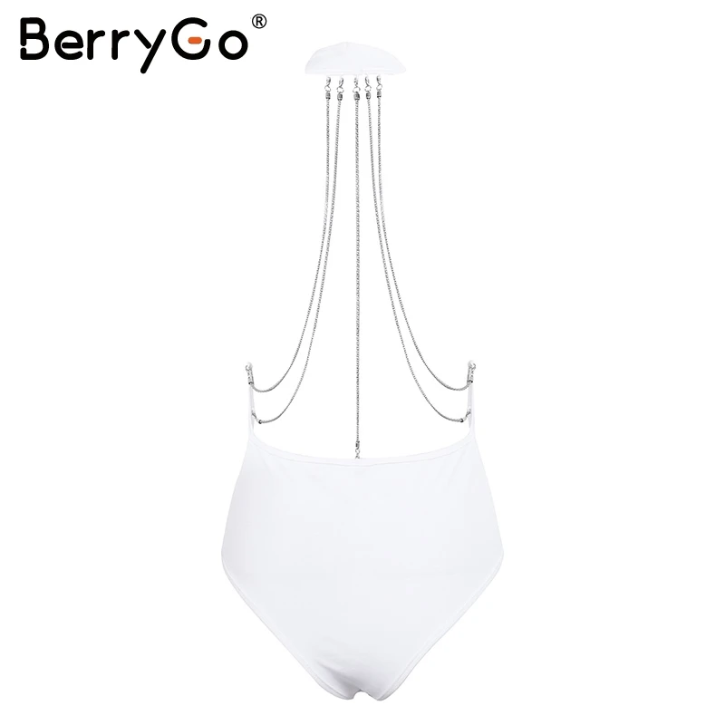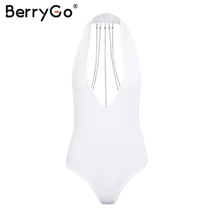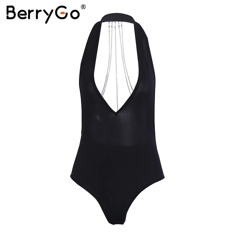 BerryGo Metal chain bodycon bodysuit playsuit Sexy backless halter women bodysuit Deep v neck bodysuit jumpsuit club party wear