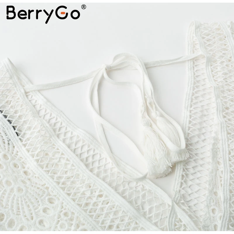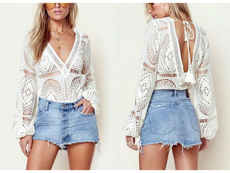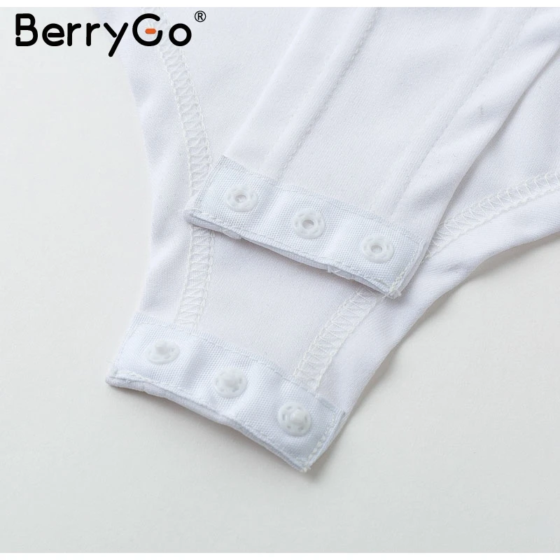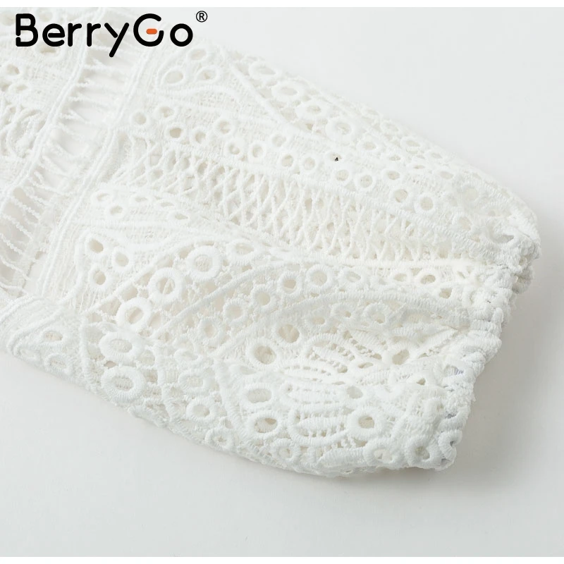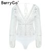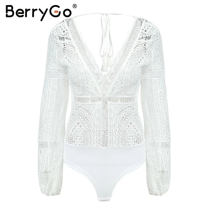 BerryGo Sexy hollow out lace bodysuit women V neck white long sleeve bodysuit Backless lace up short jumpsuits rompers 2018