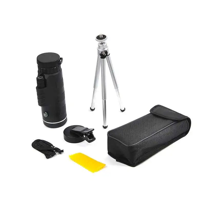 Package Contents: 1 x Monocular Telescope, 1 x Phone Clip, 1 x Lens Cloth, 1 x Tripod, 1 x Sling, 1 x Dust Cover, 1 x Pouch