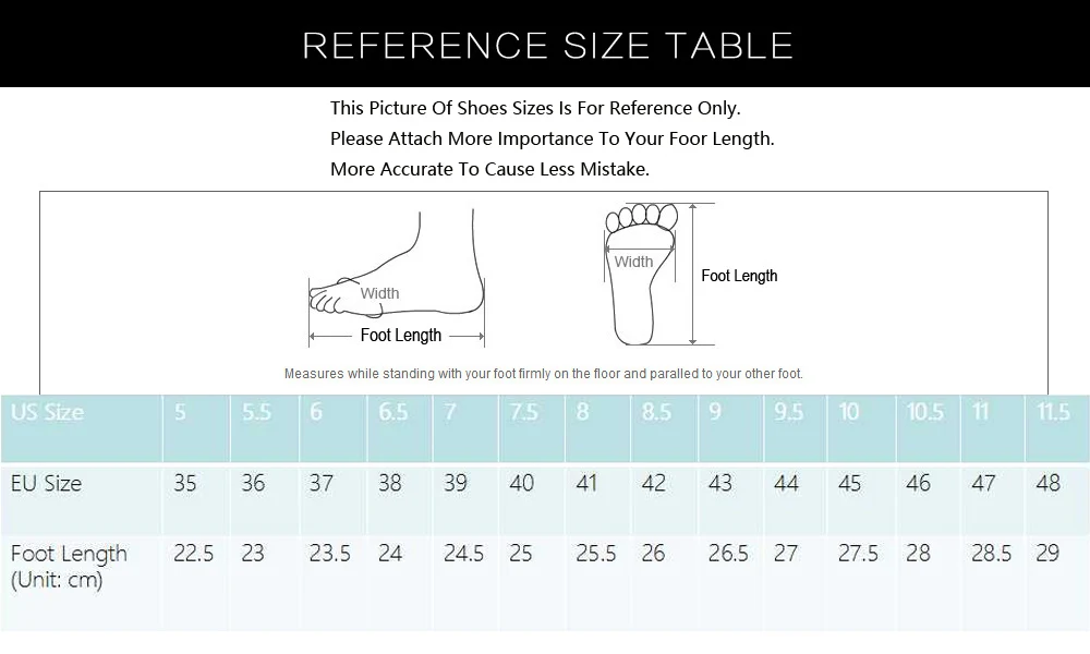 Before you make the order, you should be careful to measure your feet length (from heel to toe) and then you should pay more attention to our size table. You can find suitable size for you in our size table. Finally, you decide what size you buy!