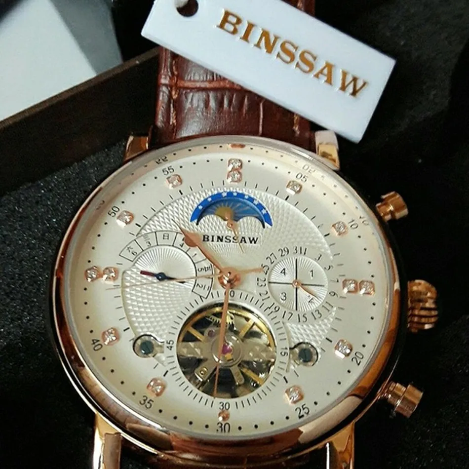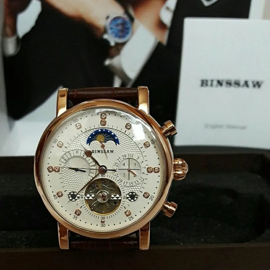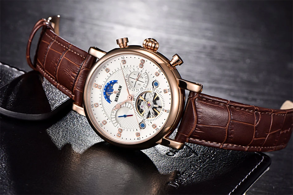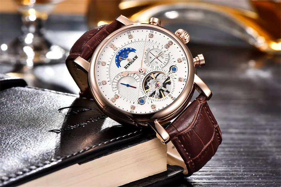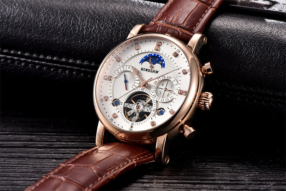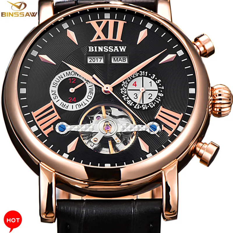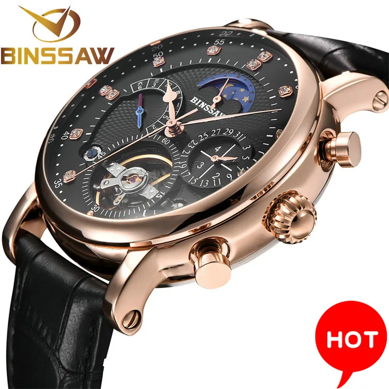 BINSSAW New Men Automatic Mechanical Watch Luxury Brand Tourbillon Mens Fashion Waterproof Leather Man Watchse relogio masculino