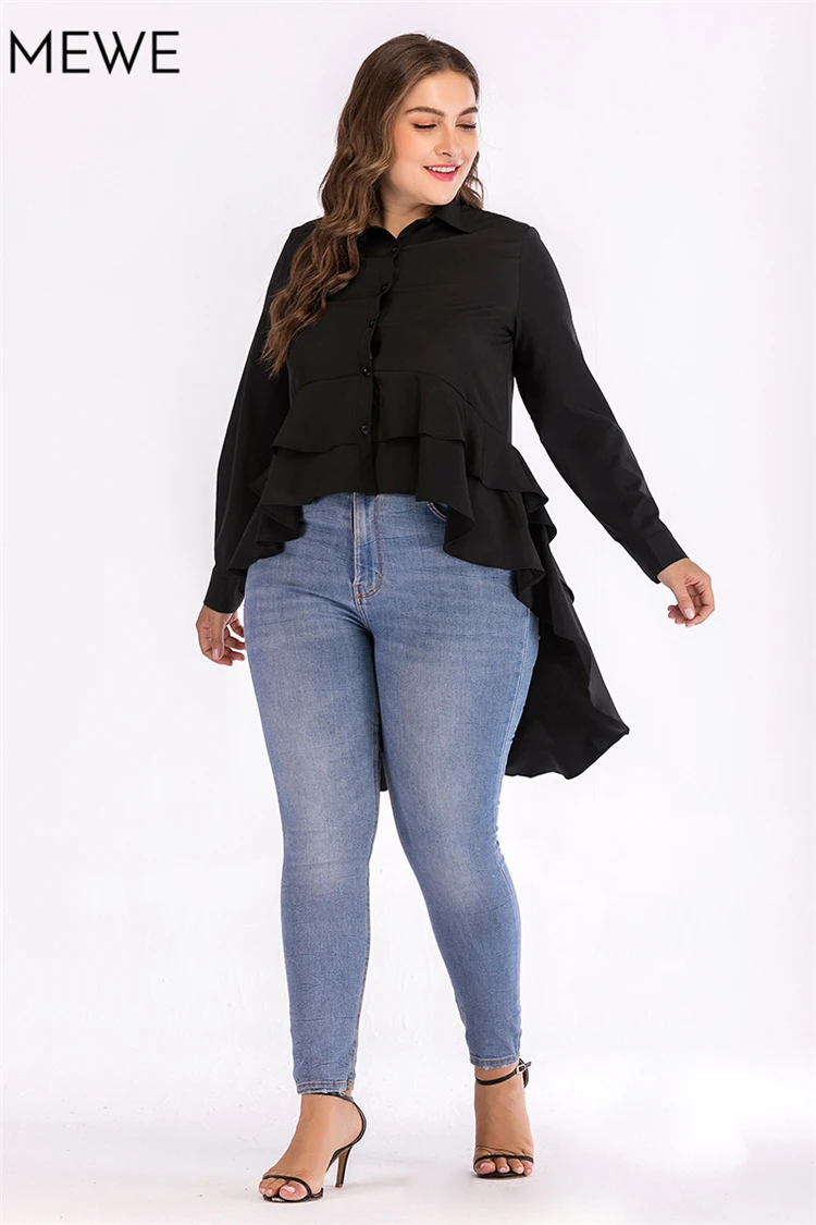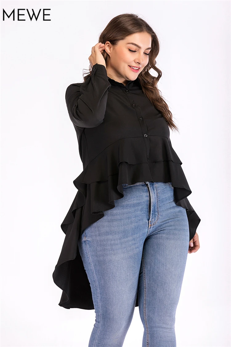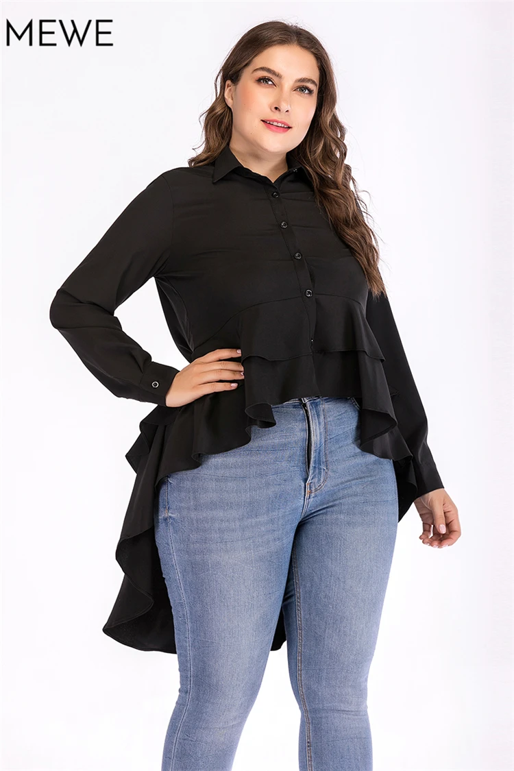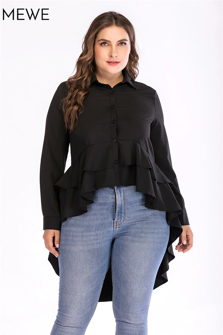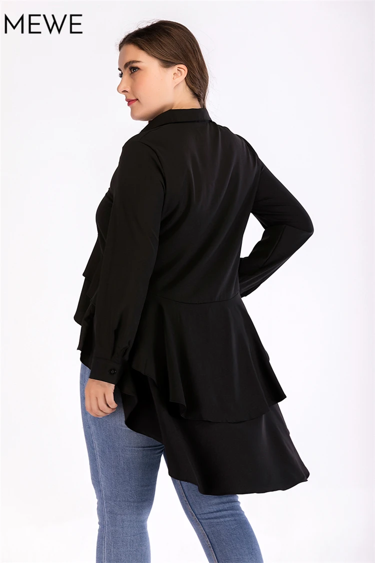 Black Blouse Women Long Sleeve Asymmetric Ruffle Turn Down Collar Slim Solid Blouses 2018 Autumn New Arrival Plus Size Blouse XL