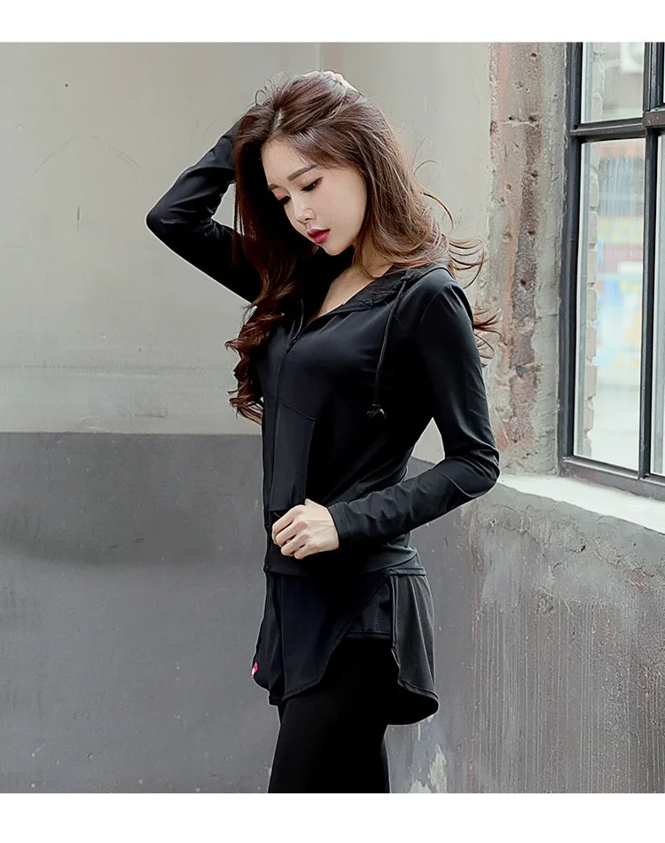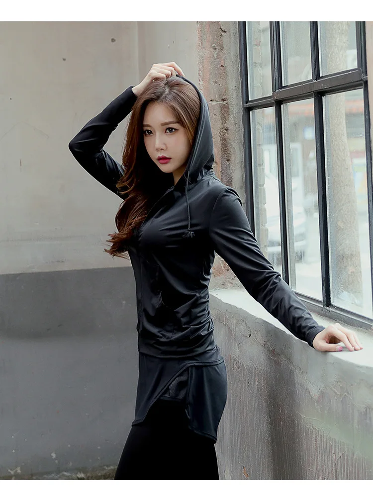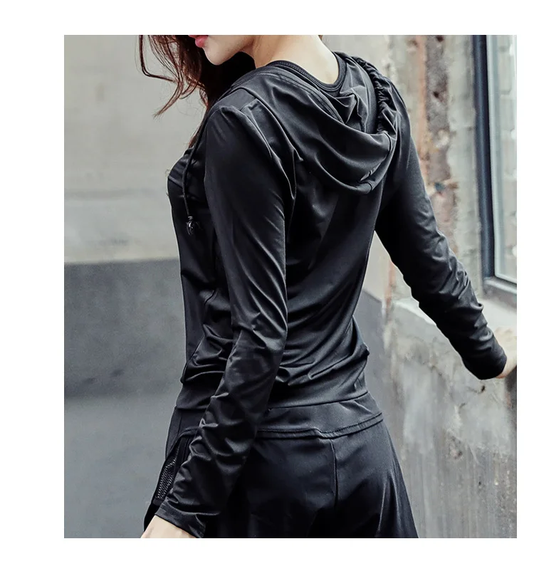 Black Fitness Jacket Women Hooded Sports Jacket Long Sleeve Sweatshirt Ladies Yoga Sports Zipper Jacket Fitness Gym Shirt