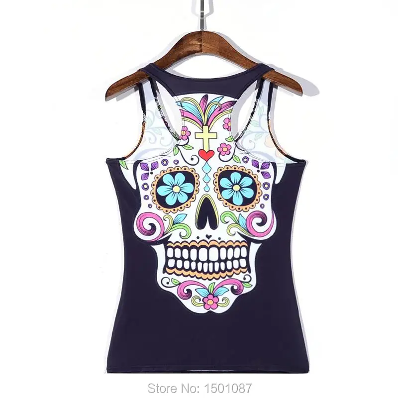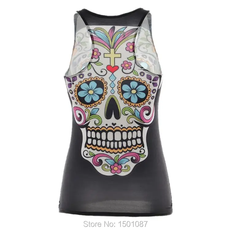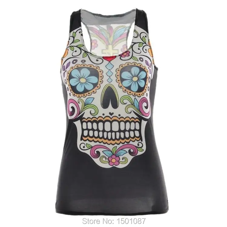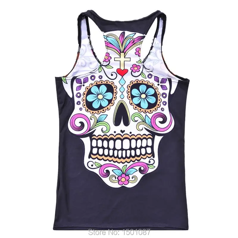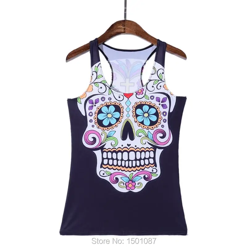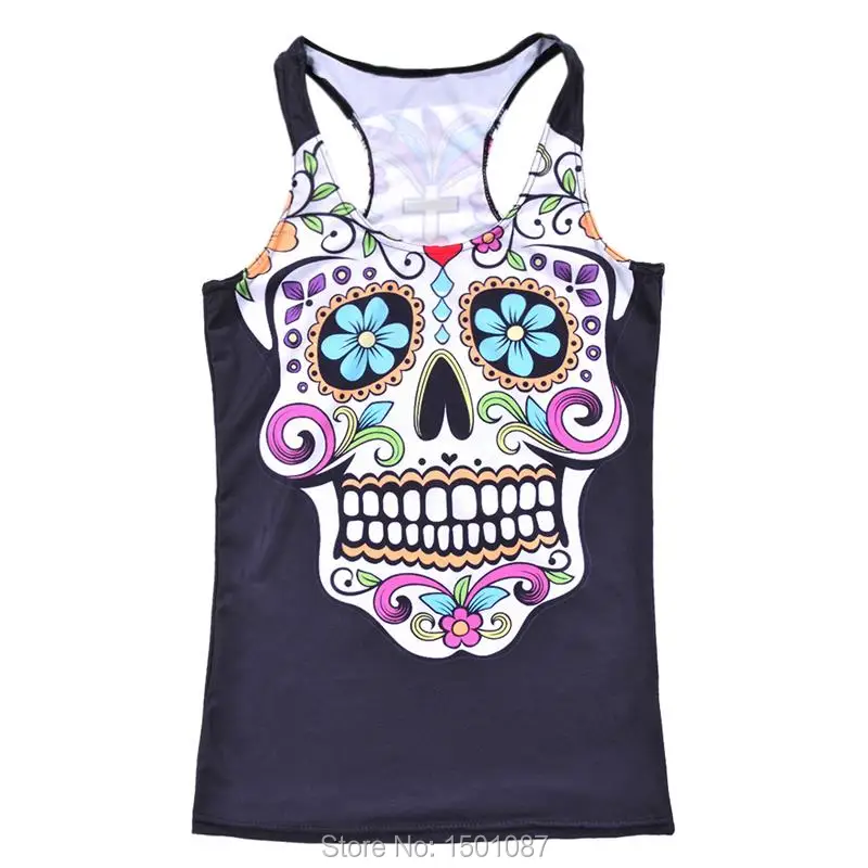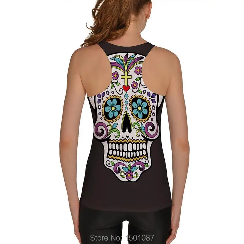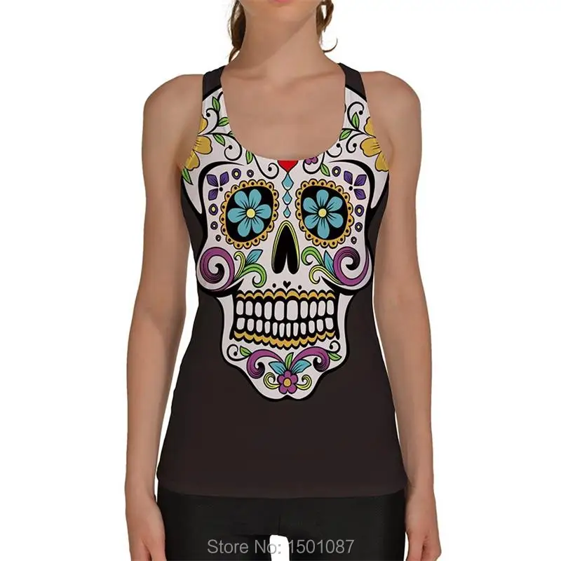 Black Women Sports Tank Tops Sexy Sleeveless T Shirt Clothes Elastic Yoga Running Vests Camisole Flower Skull Digital Print
