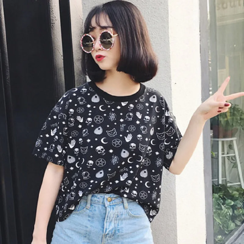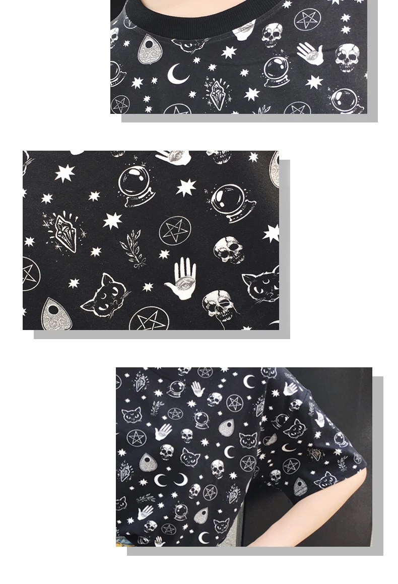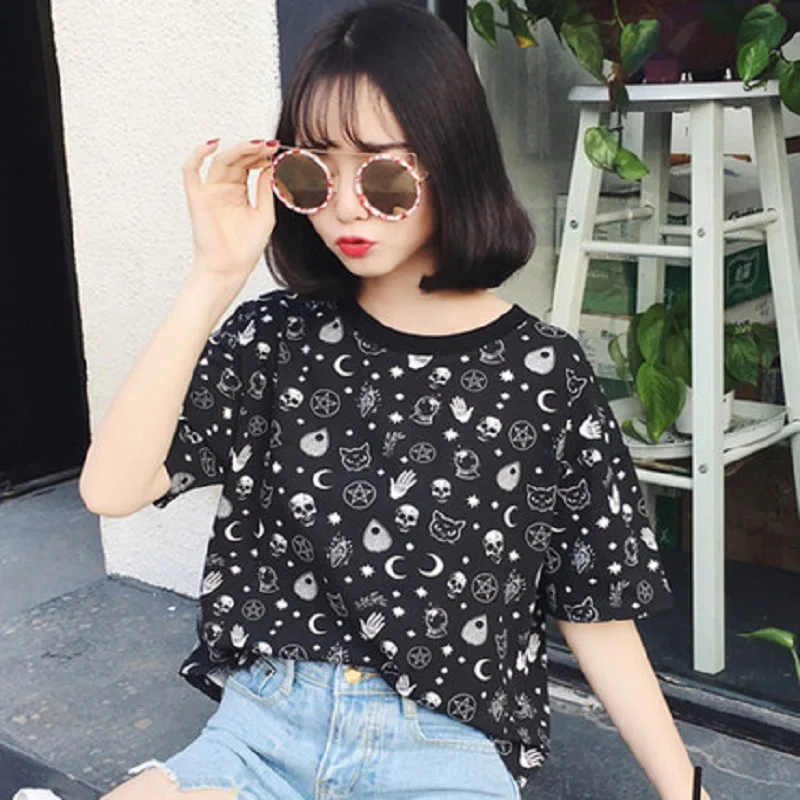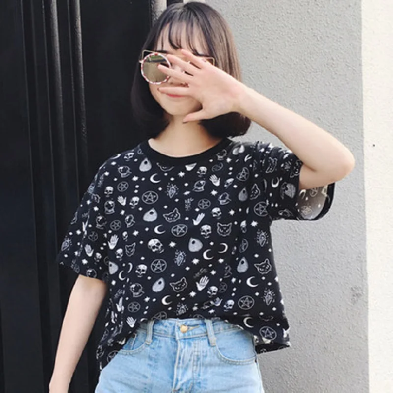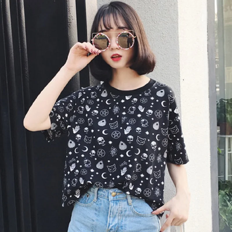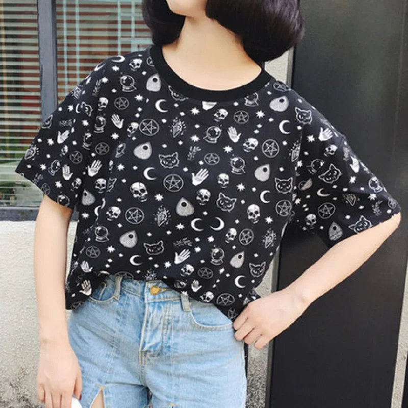 Blackest Gothic Tee Moon Witchcraft Cat Printed Harajuku Short T-Shirt Women Tops Loose Summer Skull T Shirt For Goth Girl