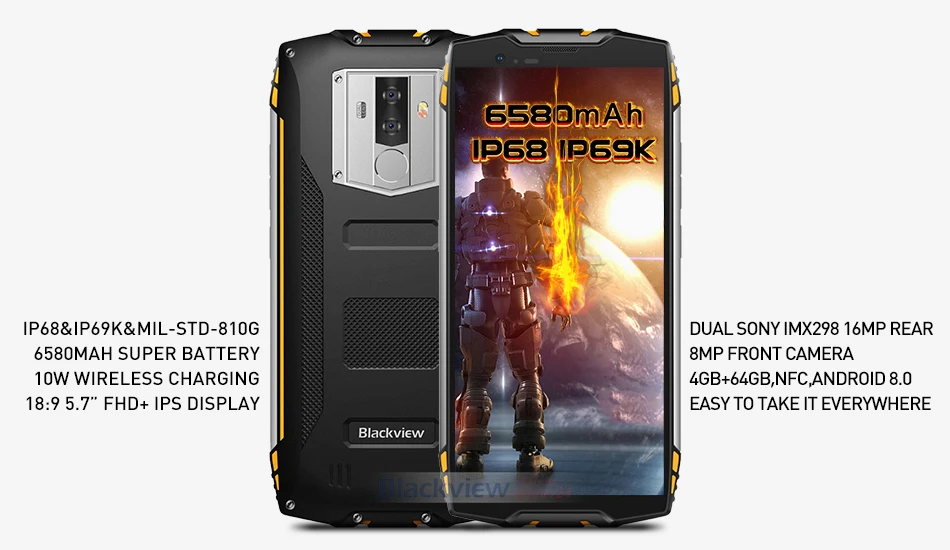 Blackview BV6800 pro 6580mAh IP68 Waterproof 16MP NFC Wireless charger 5.7″18:9 Smartphone 4GB RAM 64GB ROM MT6750T Android 8.0