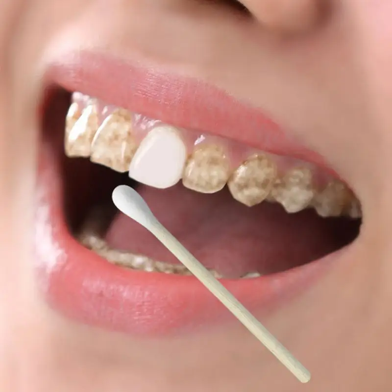 And then use a cotton swab dipped in the product, and wipe the tooth surface in front of the mirror.