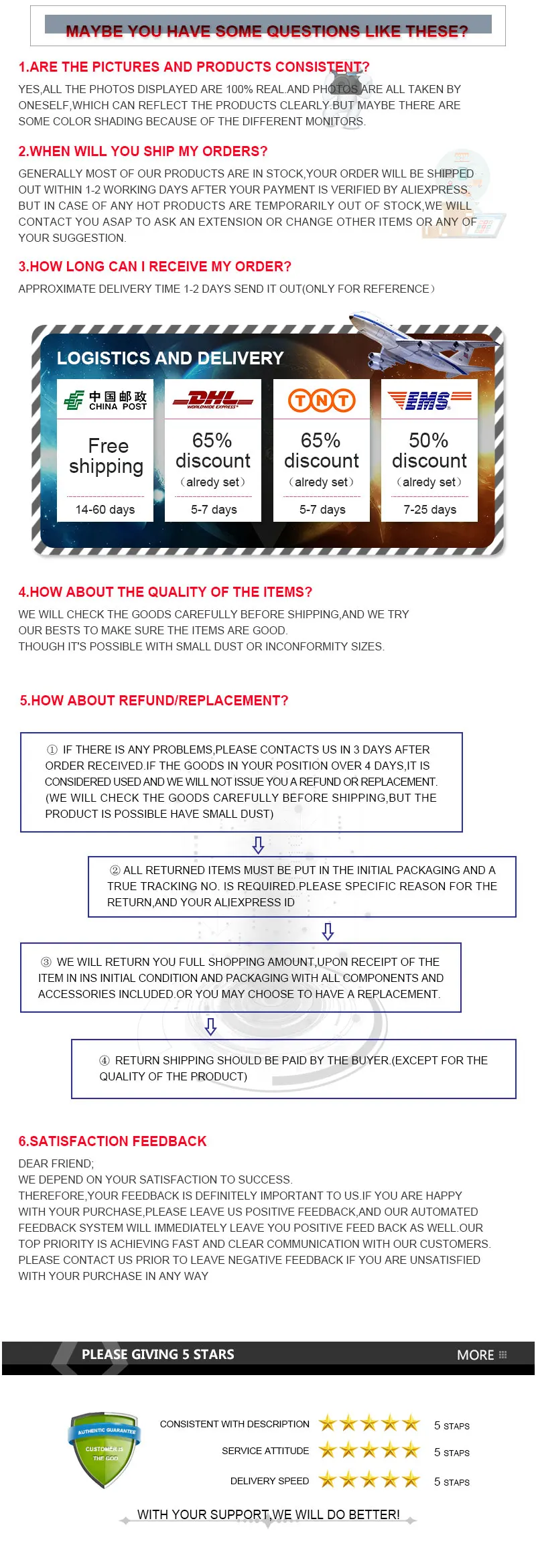 • If you did not receive the product within the guaranteed time( 45 days not including 2-5 day processing) you can request a refund or a reshipment.