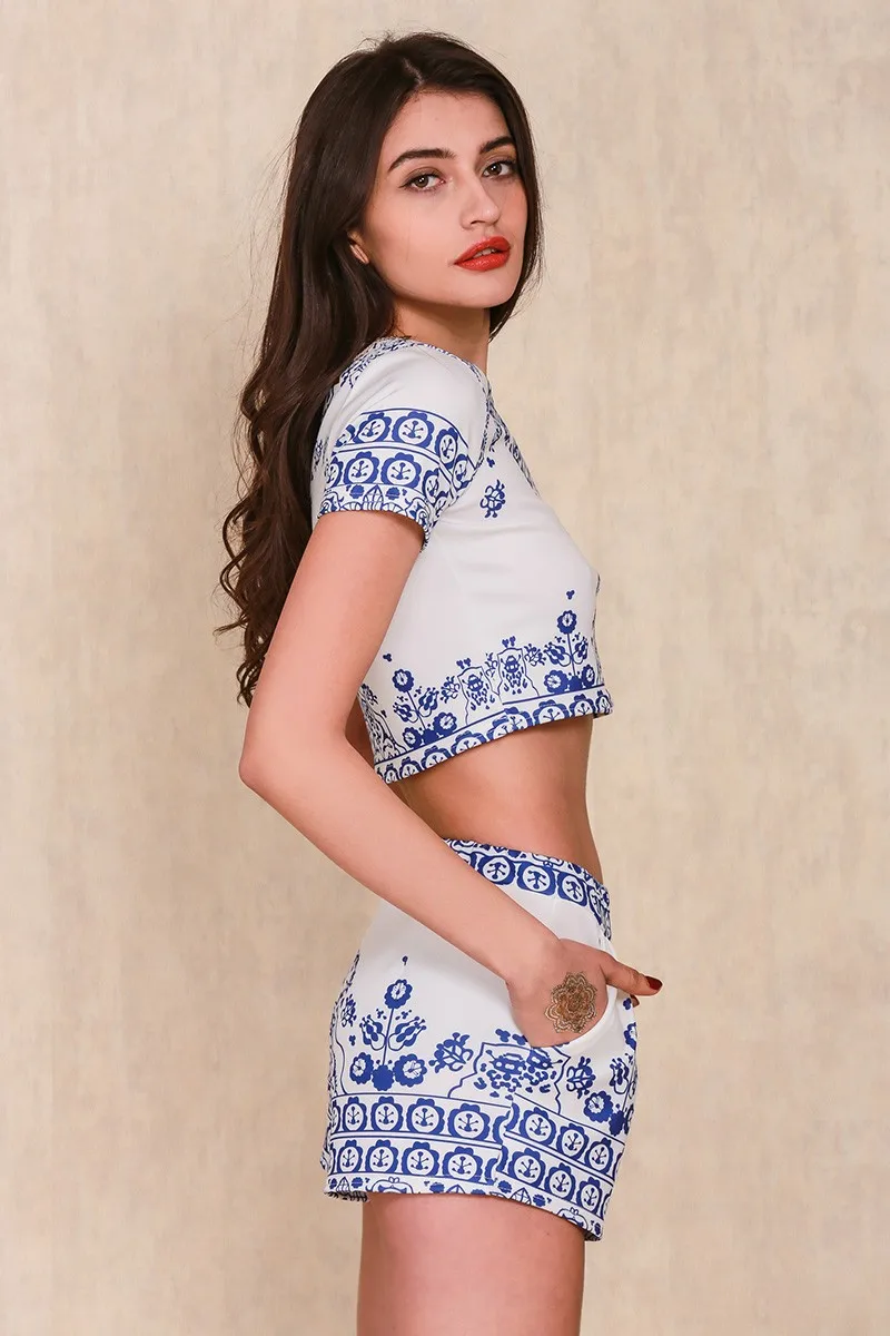 Blue Porcelain Two Piece Jumpsuit Two Piece Jumpsuit Romper Women Short Sleeve Crop Top Playsuit Vintage Overall Suit