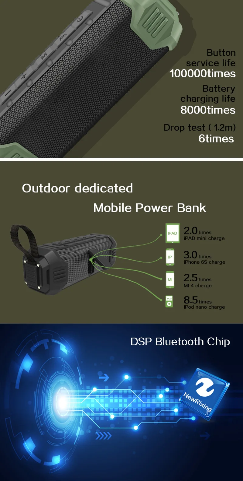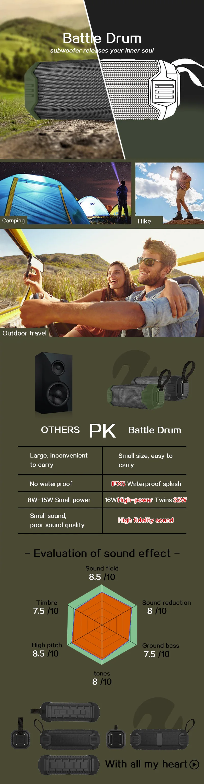 Portable speaker have an excellent sound quality, suitable all types of music. 2 x 8 Watts high-end low-impedance internal-magnetic speakers and the dual-driver make the sound distortion-free and clarity. Besides, the build-in passive subwoofer for adding balanced bass.