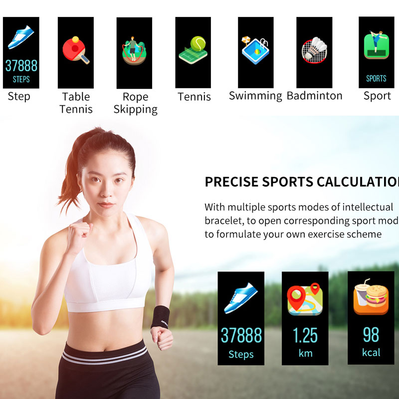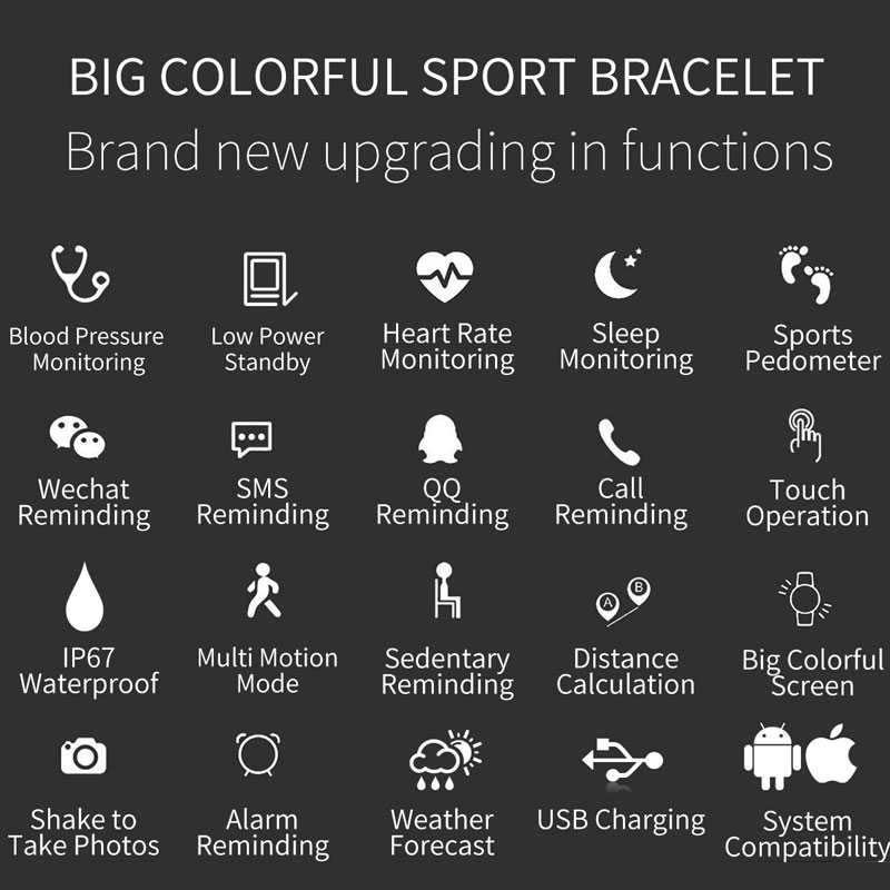 1. Function:touch panel;blood pressure;heart rate monitor;step pedometer;calories;distance track;sleep monitor;alarm;message reminder