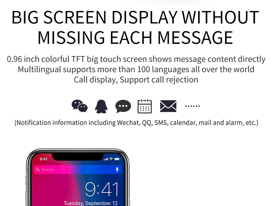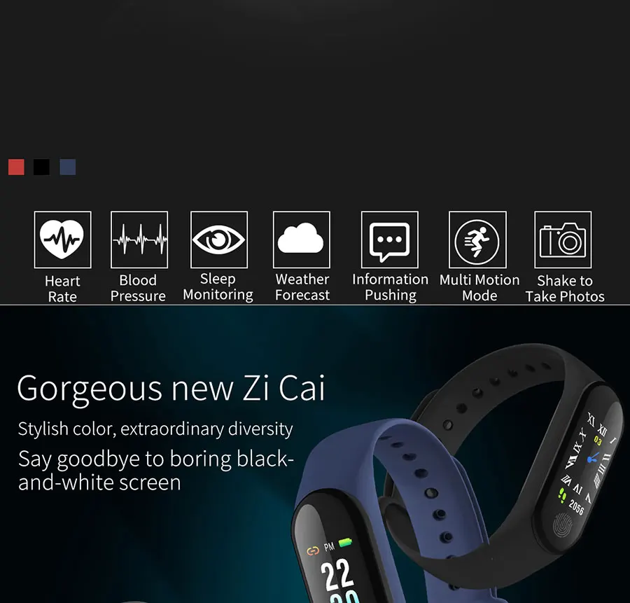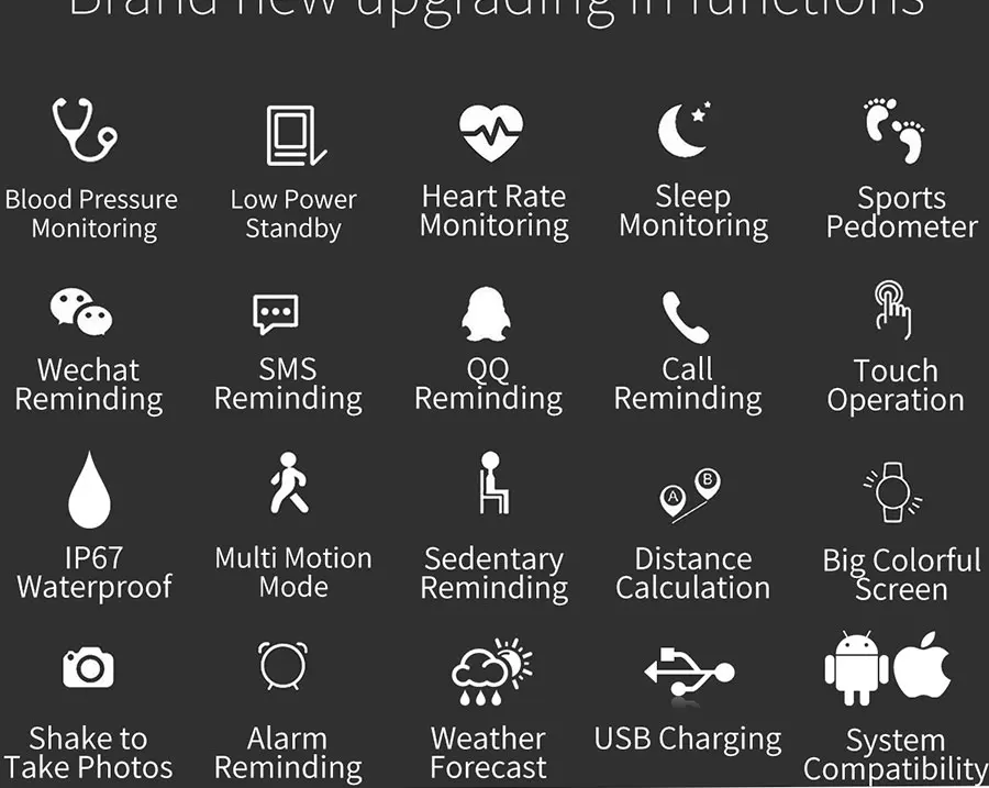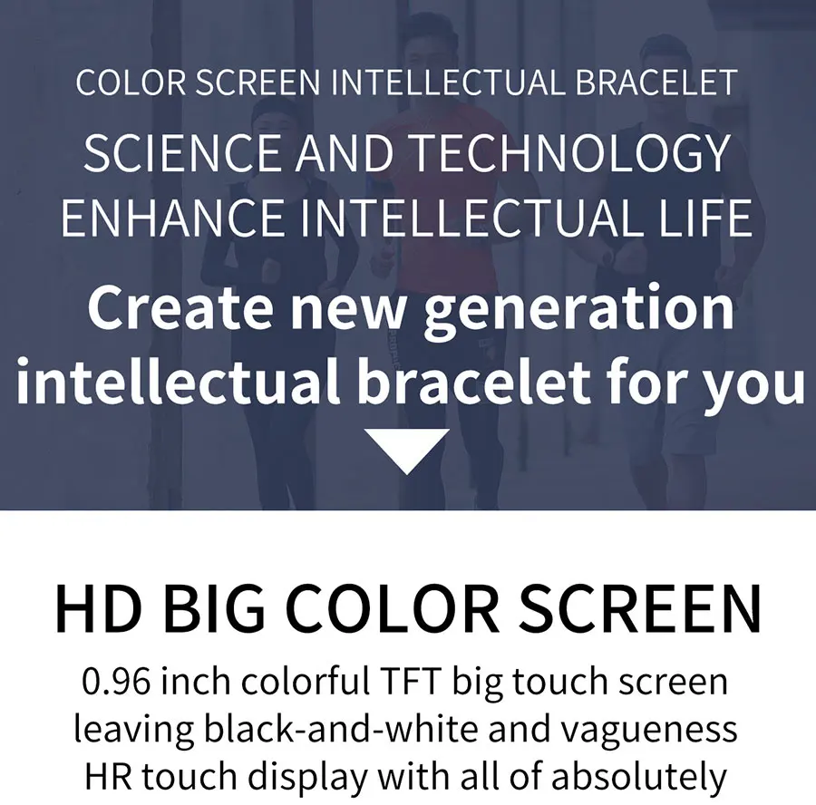 1. Function:touch panel;blood pressure;heart rate monitor;step pedometer;calories;distance track;sleep monitor;alarm;message reminder