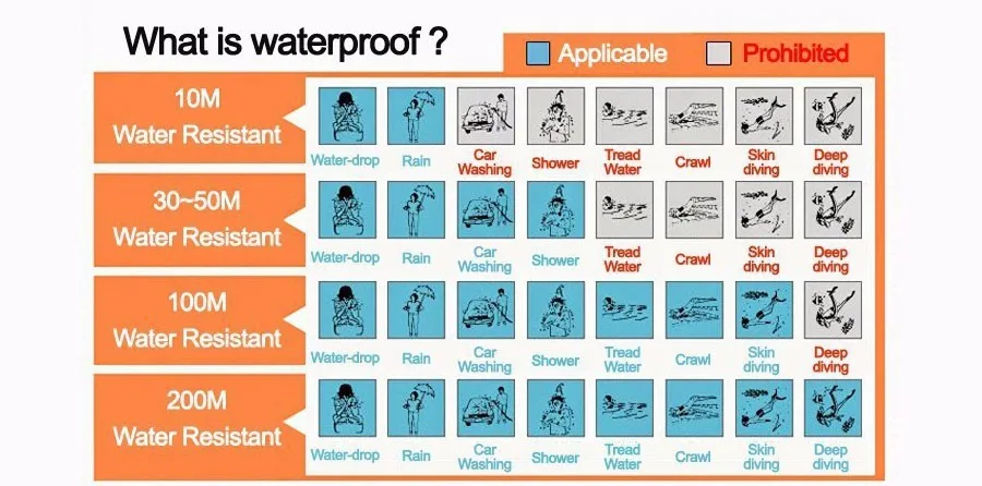 A. water resistant : IP67 waterproof . suitable for all kinds of daily use like raining, washing hands,splashes. NOTE: please DO NOT pull out the watch crown in water,or wearing watch for long-time underwater activities
