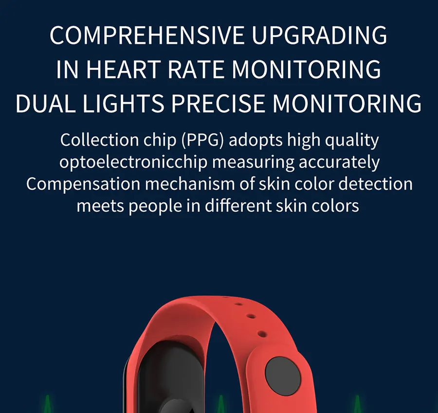The principle is the photoelectric transmission measurement method. In principle, the sensor that the wristband contacts the skin emits a beam of light on the skin and measures the reflected/transmitted light. Because the blood absorbs light at a specific wavelength, each time the heart pumps blood, the wavelength is absorbed in large amounts, the blood is red, the red light is reflected, and the green light is absorbed, so that the heartbeat can be determined. . Our wristband combines green LED light with a photosensitive photodiode to measure the amount of blood circulating at the wrist at a specific time to obtain heart rate information.