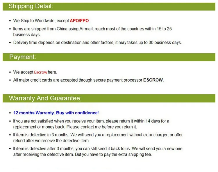 • If you did not receive the product within the guaranteed time( 45 days not including 2-5 day processing) you can request a refund or a reshipment.