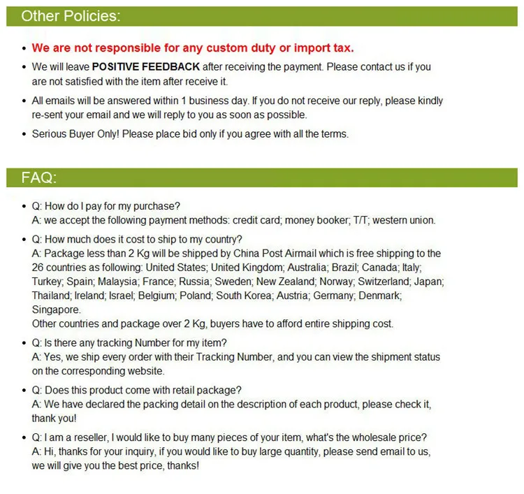 We are not responsible for any custom fees once the items have shipped. By purchasing our products, you consent that one or more packages may be shipped to you and may get custom fees when they arrive in your country.