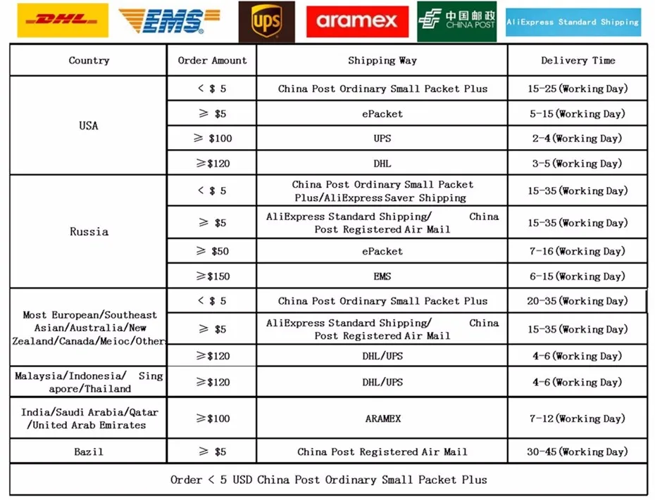 Packages from our warehouse in China will be shipped by ePacket or EMS depending on the weight and size of the product. Packages shipped from our US warehouse are shipped through USPS.