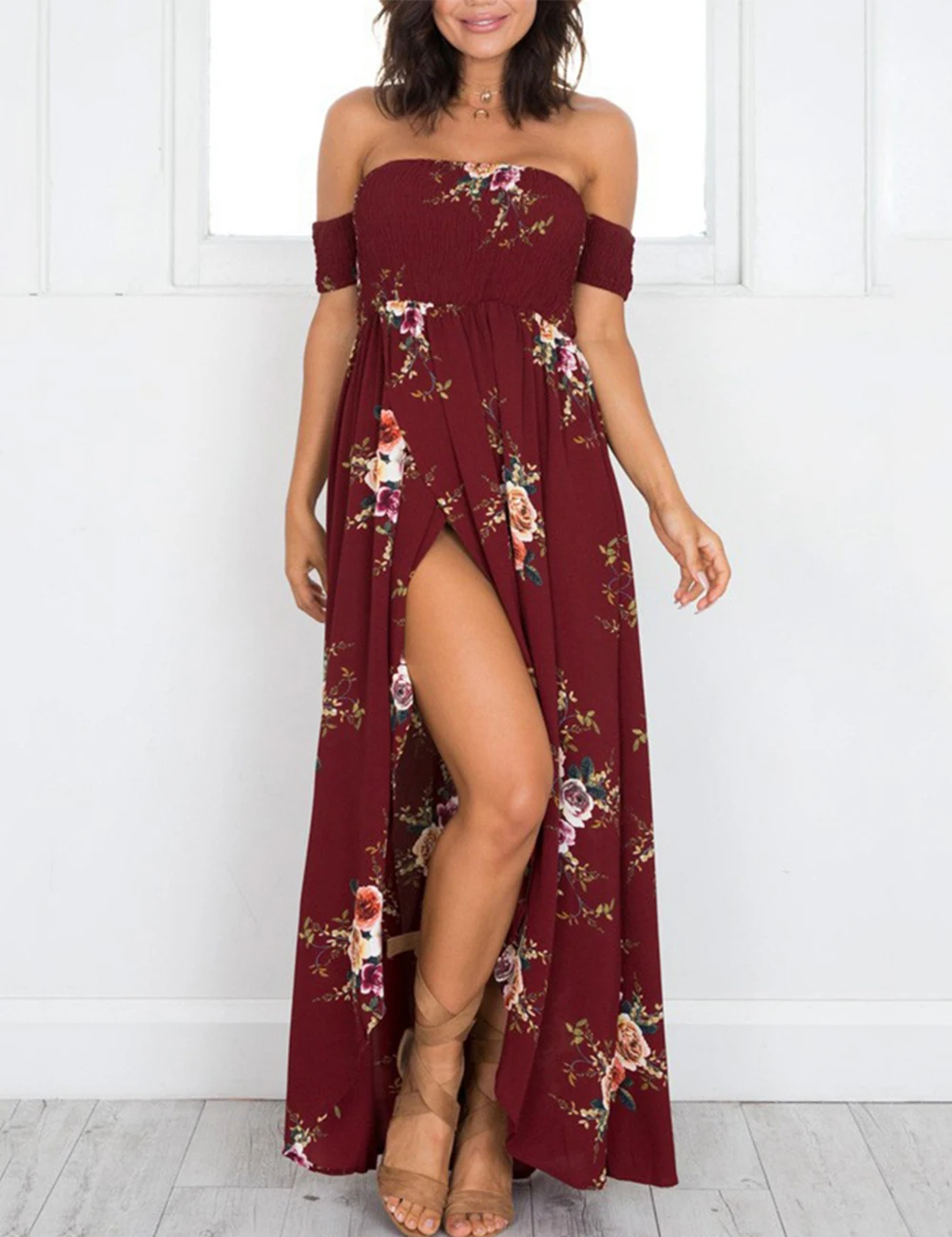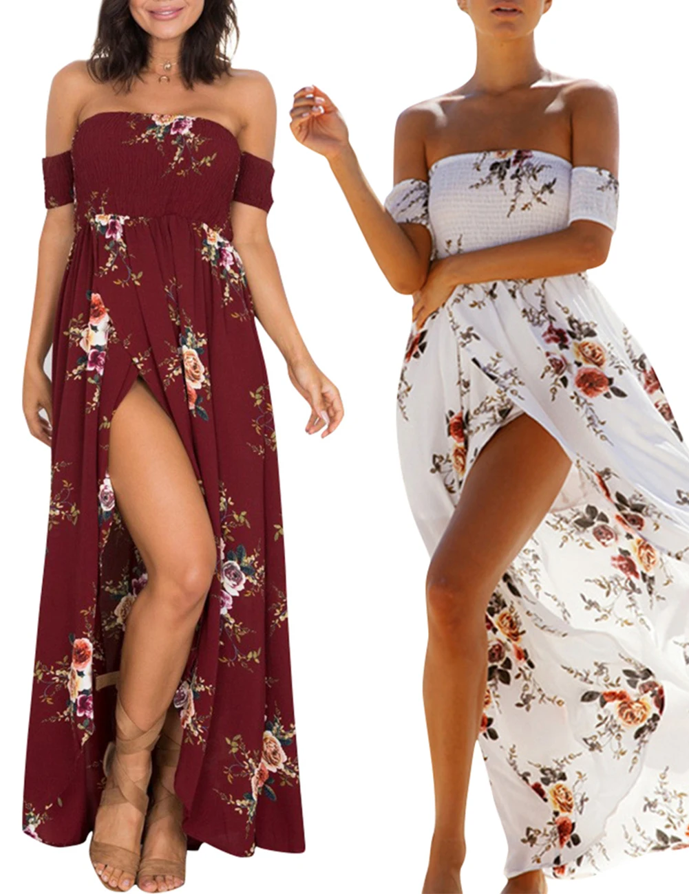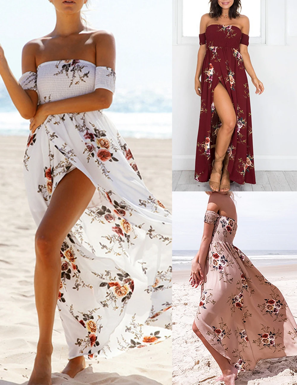 Boho Style Long Dress Women Off Shoulder Beach Summer Floral Print Vintage Chiffon Dresses vestidos de festa For Gifts A2