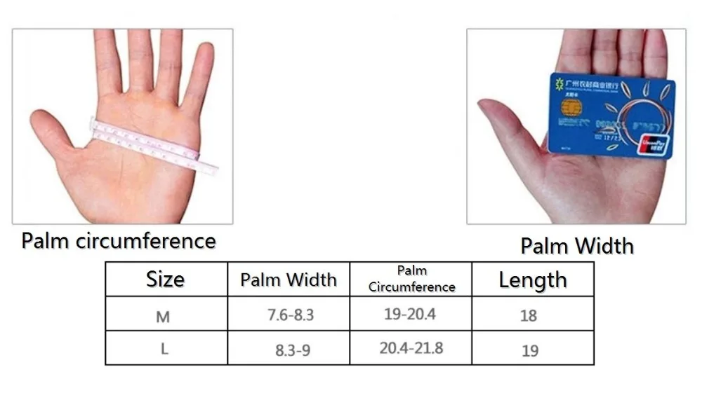 L For Palm Width 8.3cm to 9cm ,Palm Circumference 20.4 to 21.8,Length 19cm
