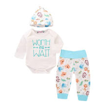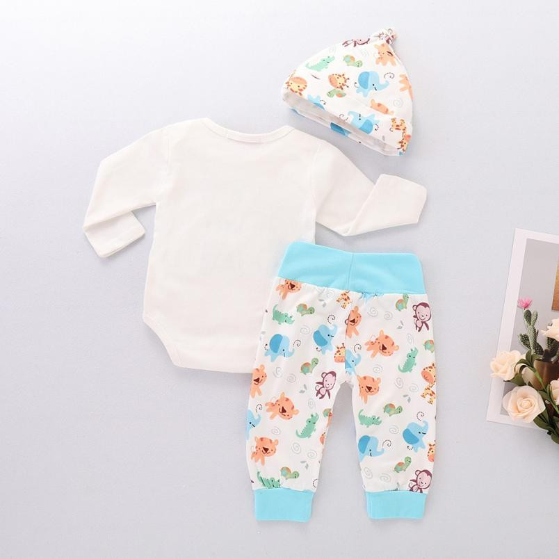 Boys Girls Clothing Set Cute Baby Kids Long Sleeve Letter Printed Romper+ Cartoon Print Pants + Hat Three-Piece Set Soft Clothes