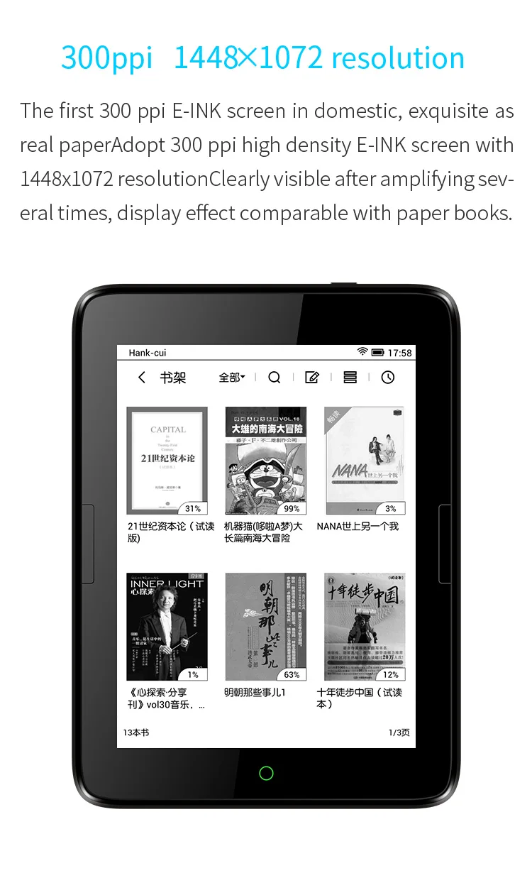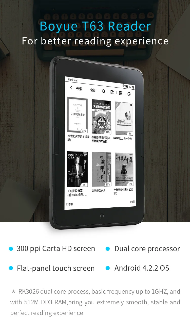 Boyue T63 ebook reader dual core cpu e ink 300PPI touch screen built in backlight front light Android ebook ereader TP LENS WIFI