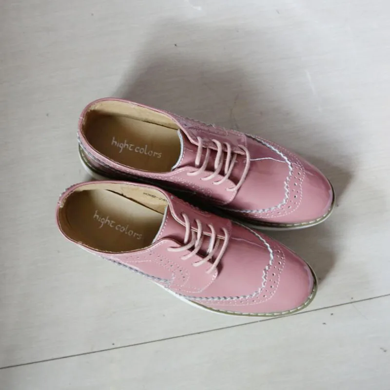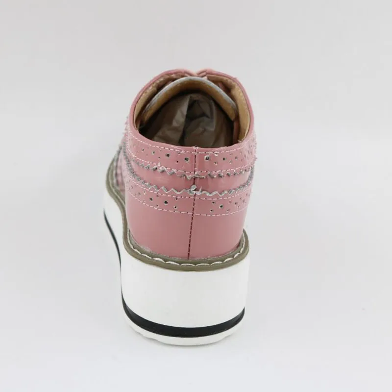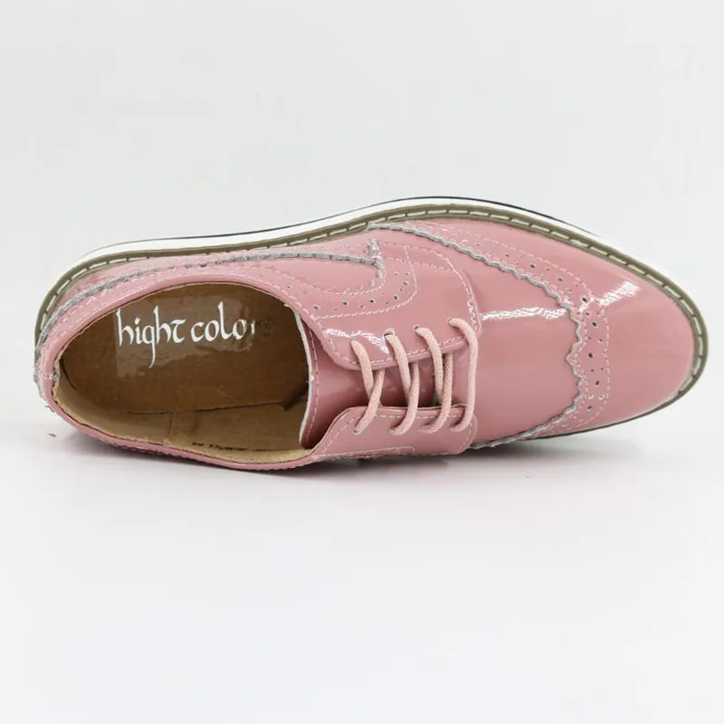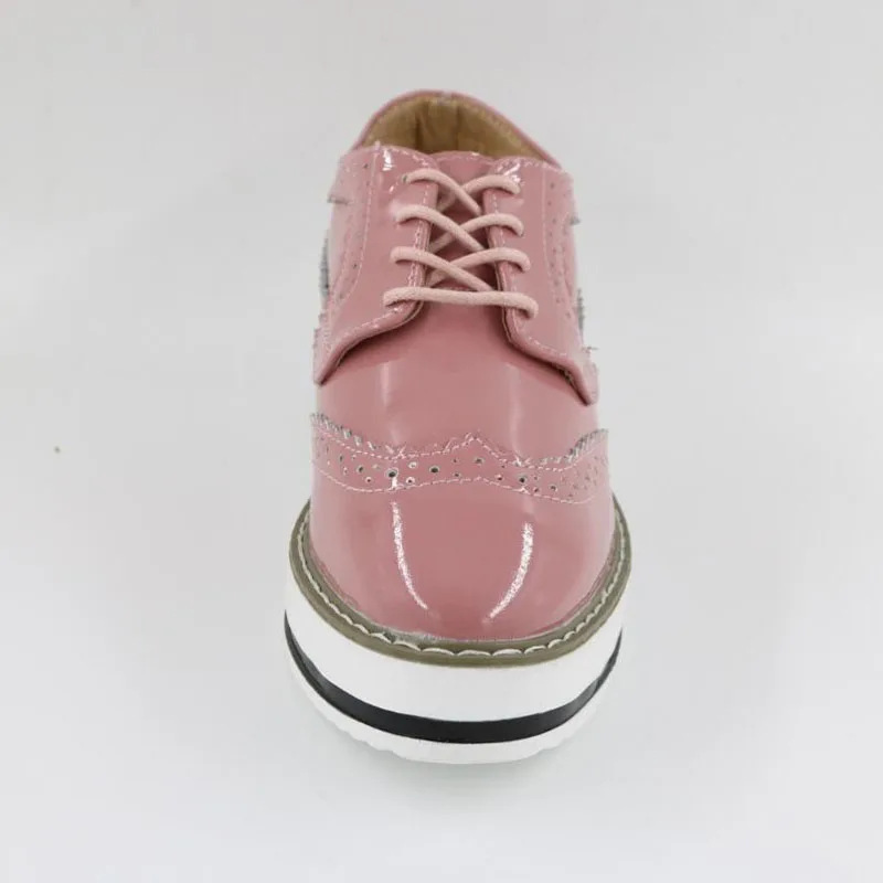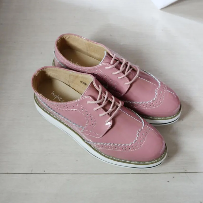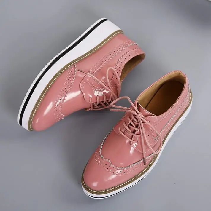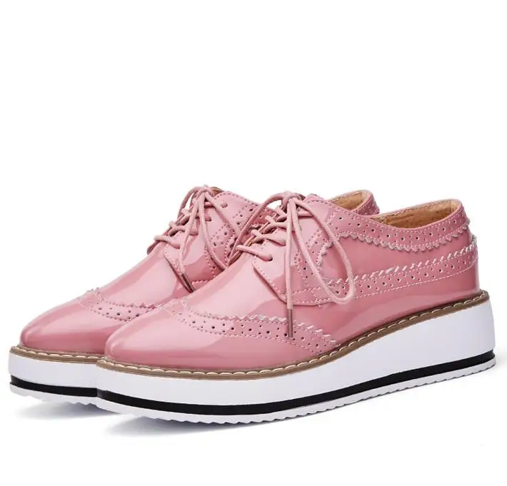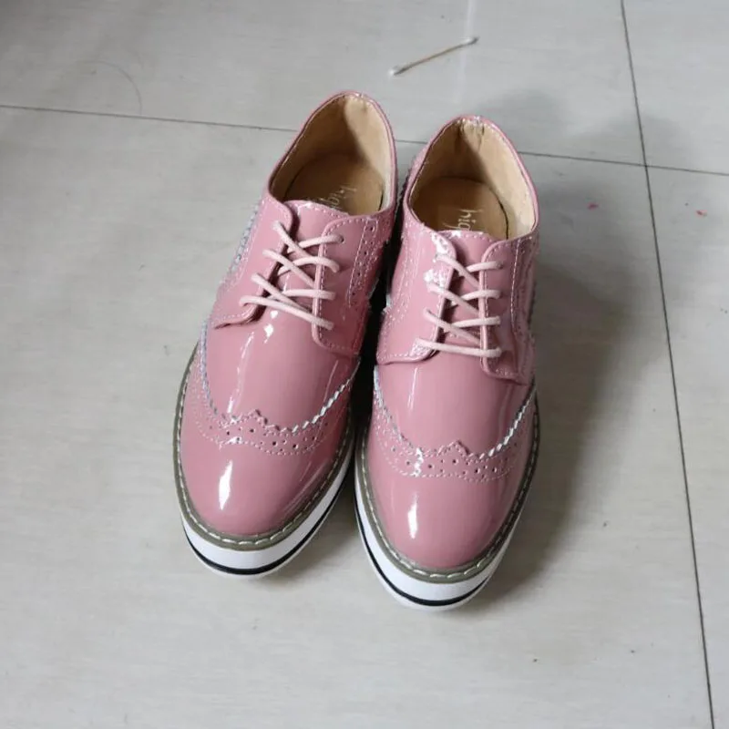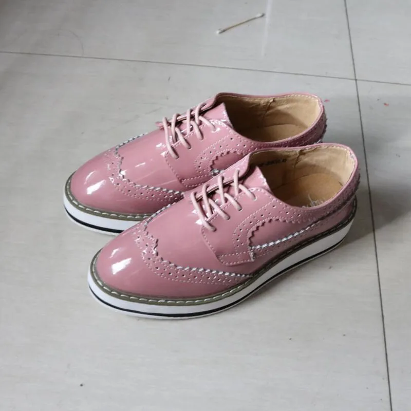 Brand Female Pink Footwear Shoes For Women Creepers Platform Oxfords Brogue Flats Shoes Patent Leather Lace Up Pointed Toe Flat