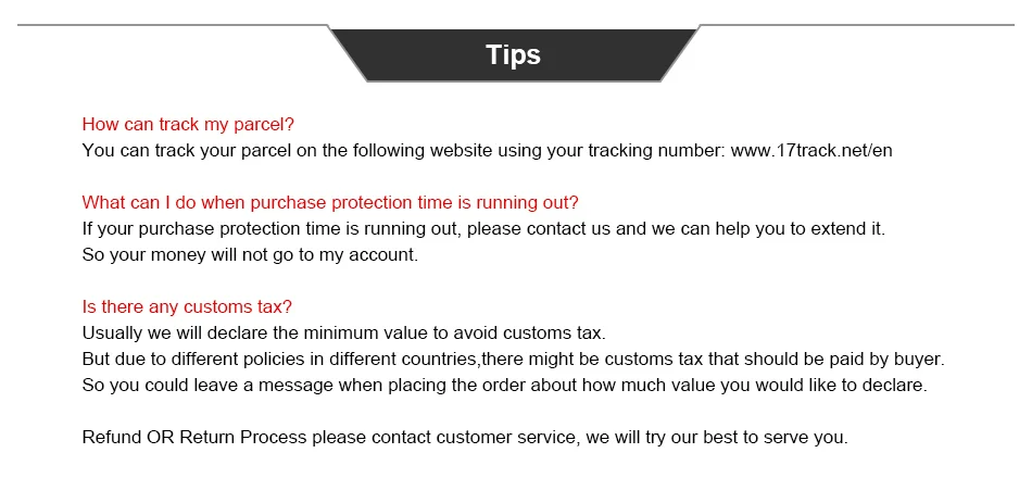 • If you did not receive the product within the guaranteed time( 45 days not including 2-5 day processing) you can request a refund or a reshipment.
